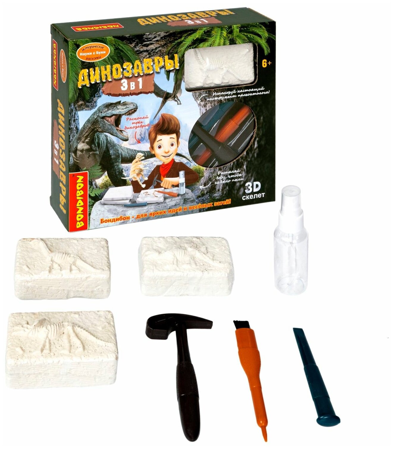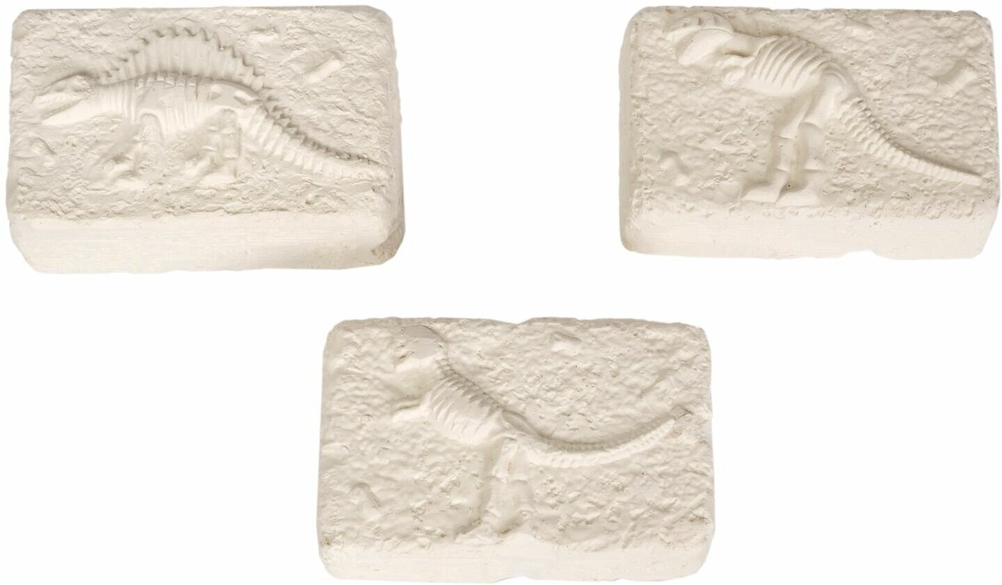 | Комплектация | 3 блока для проведения раскопок, молоток, зубило, пузырек с пульверизатором, скелеты 3 динозавров внутри гипсовых блоков |