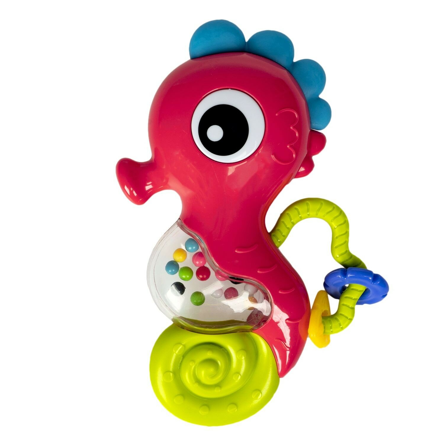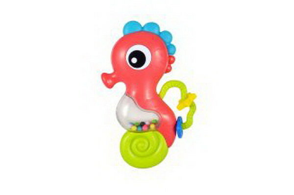 Плавник и бусины на спине конька являются элементами, помогающими при прорезывании зубов, а цветные бусины в прозрачной части корпуса - радуют глаз и развивают слух и внимание малыша.