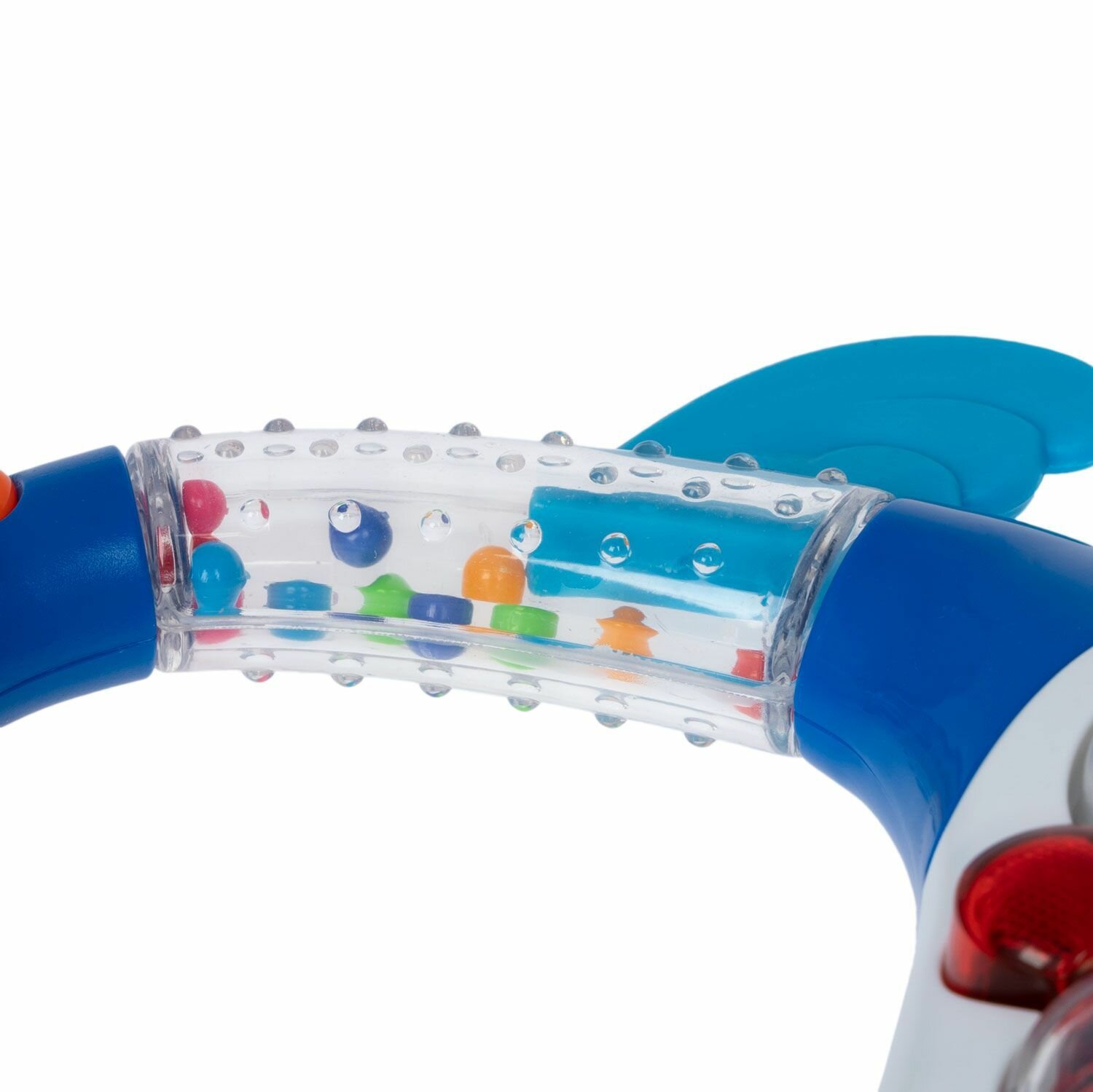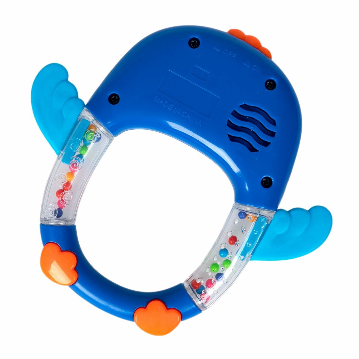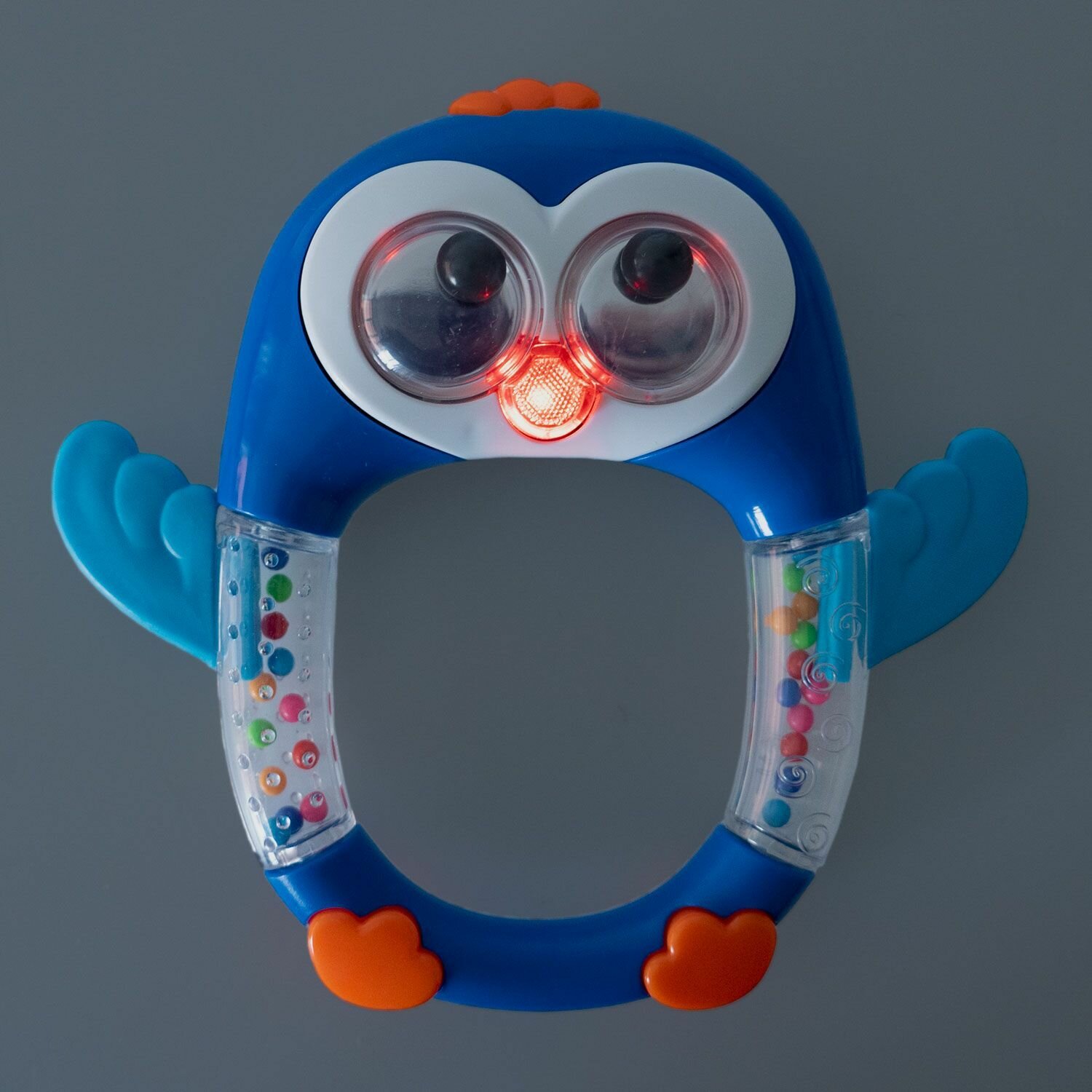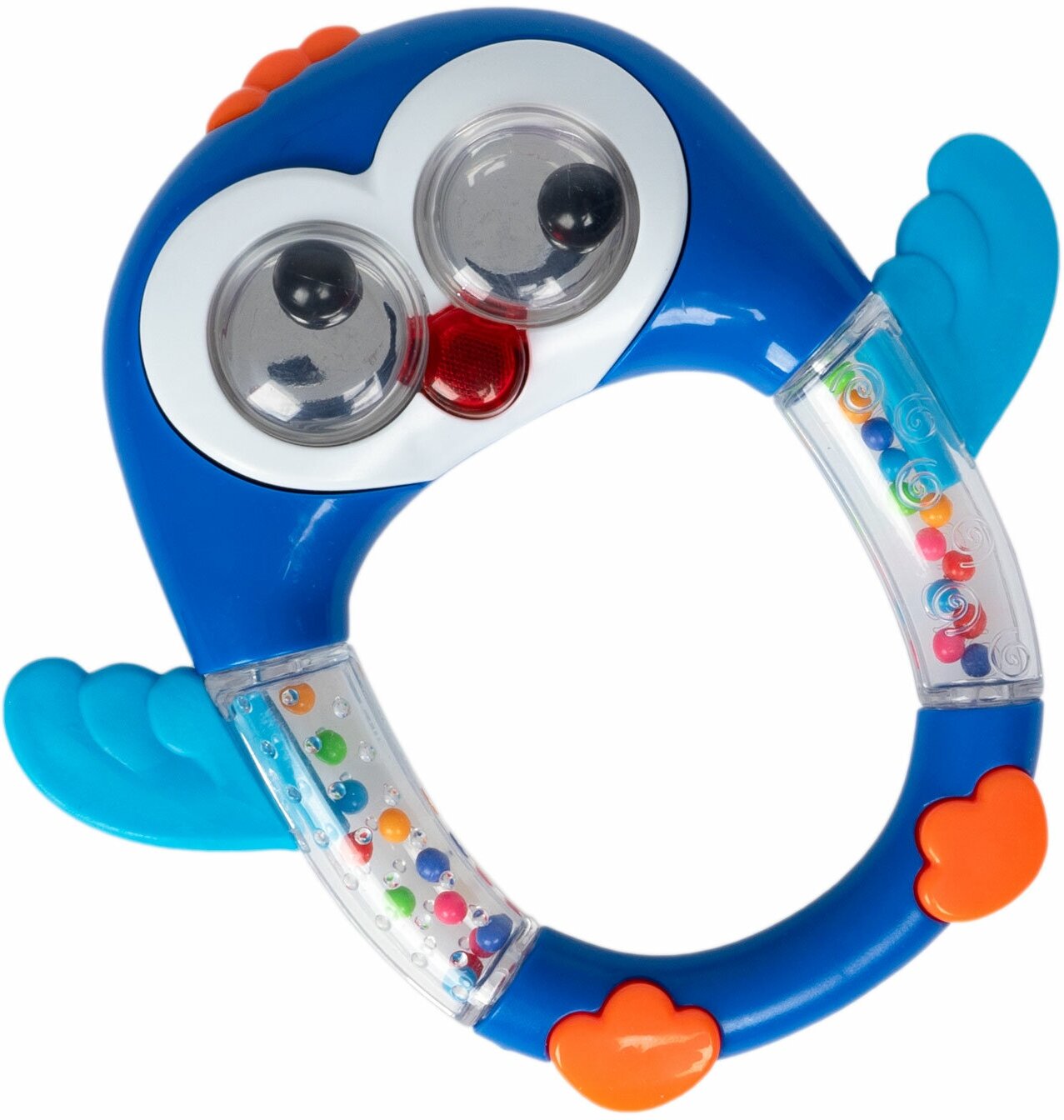 Крылышки птицы являются элементами, помогающими при прорезывании зубов, а цветные бусины в прозрачной части корпуса - радуют глаз и развивают слух и внимание малыша.
