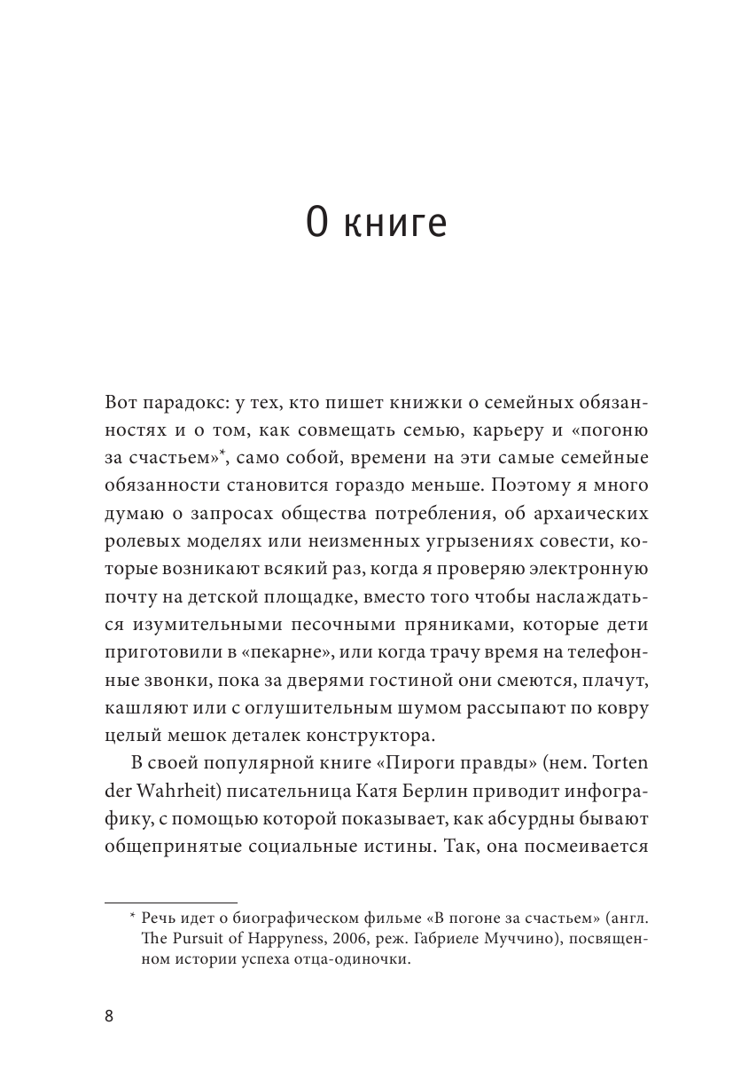 Немецкий журналист и отец двух дочерей Тобиас Морштедт в своей книге задался вопросом: что мешает современным папам заниматься воспитанием детей наравне с мамами, и как это исправить? Изучив статистику и результаты последних научных исследований, он развенчивает популярные мифы об отцовстве, убедительно доказывая, что забота о ребенке и активное участие мужчин в семейных делах укрепляют отношения и делают счастливыми и родителей, и детей.