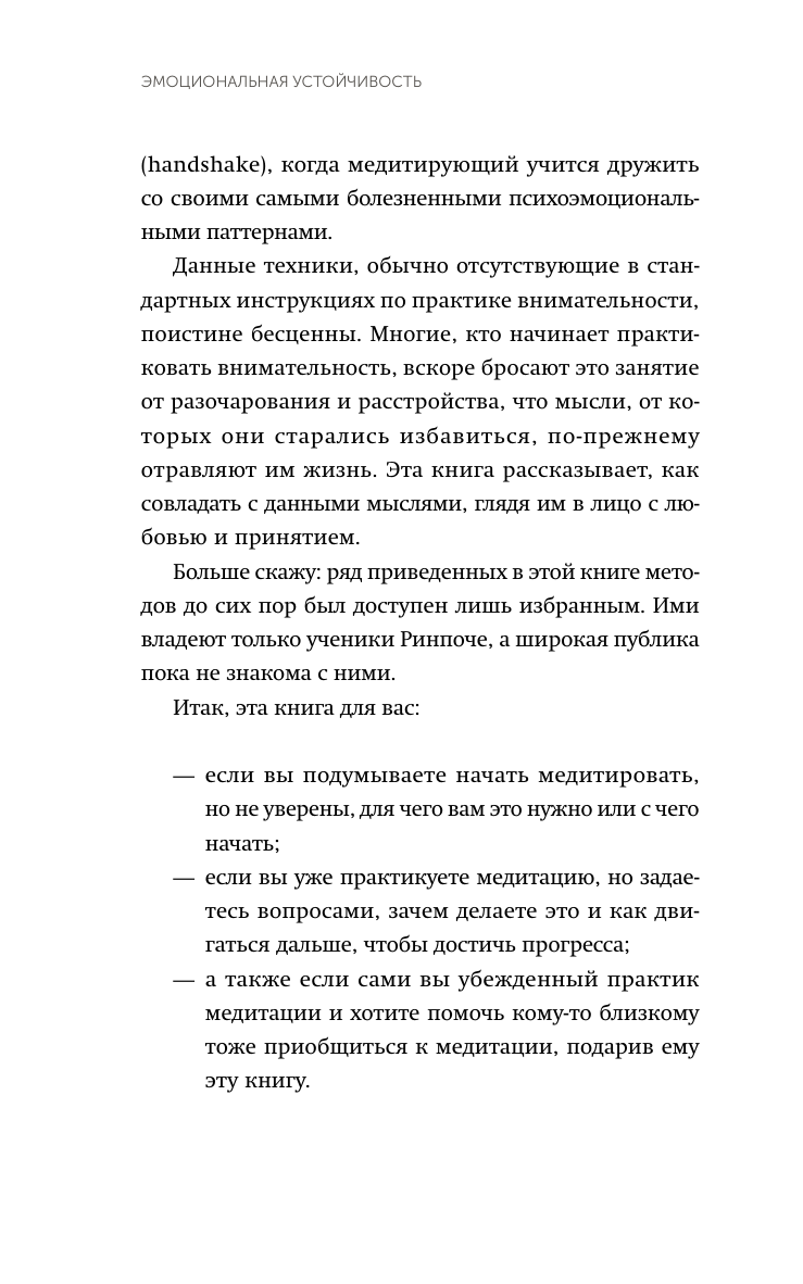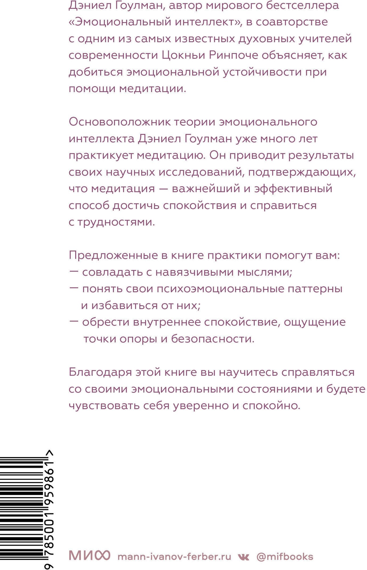 Основоположник теории эмоционального интеллекта Дэниел Гоулман уже много лет практикует медитацию. Он приводит результаты своих научных исследований, подтверждающих, что медитация - важнейший и эффективный способ достичь спокойствия и справиться с трудностями. Предложенные в книге техники отражают новый подход, который выдающийся мастер тибетского буддизма Цокньи Ринпоче вырабатывал и оттачивал последние несколько десятилетий. Ряд этих техник до сих пор были доступны лишь избранным - ученикам Ринпоче. Эти практики помогут вам: