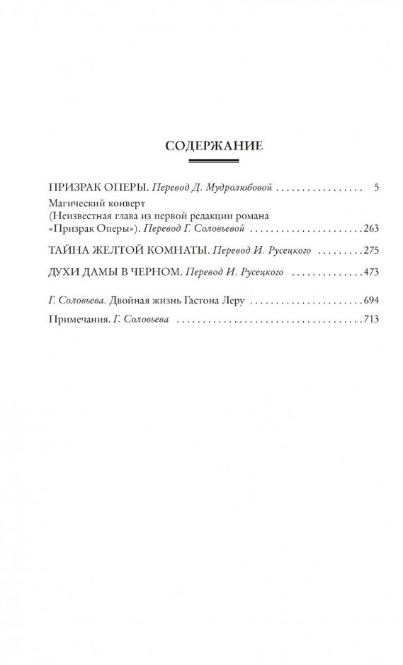 Гастон Леру — классик детективного и мистического романа. Вот уже более века по его книгам снимаются фильмы и сериалы, ставятся спектакли и мюзиклы. Особенно прославился в этом плане один из самых известных французских романов всех времен — «Призрак Оперы». Эта захватывающая готическая история о загадочном существе, обитающем в подземельях знаменитой Парижской оперы, до сих пор способна держать в напряжении читателя от первой до последней страницы. В настоящее издание, помимо «Призрака Оперы», вошли первые, и самые известные, романы о приключениях репортера Жозефа Рультабийля: «Тайна Желтой комнаты» (Джон Диксон Карр считал «Тайну...» лучшей историей о преступлении в герметично замкнутом пространстве) и «Духи дамы в черном». Также в книгу включена никогда не переводившаяся на русский язык дополнительная глава к «Призраку Оперы», входившая в первую редакцию романа.