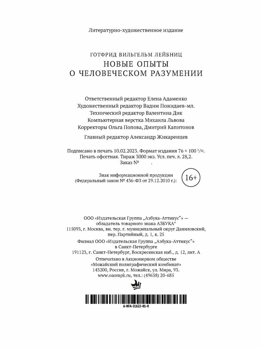 Новые опыты о человеческом разумении (Готфрид Вильгельм Лейбниц); Азбука, 2023