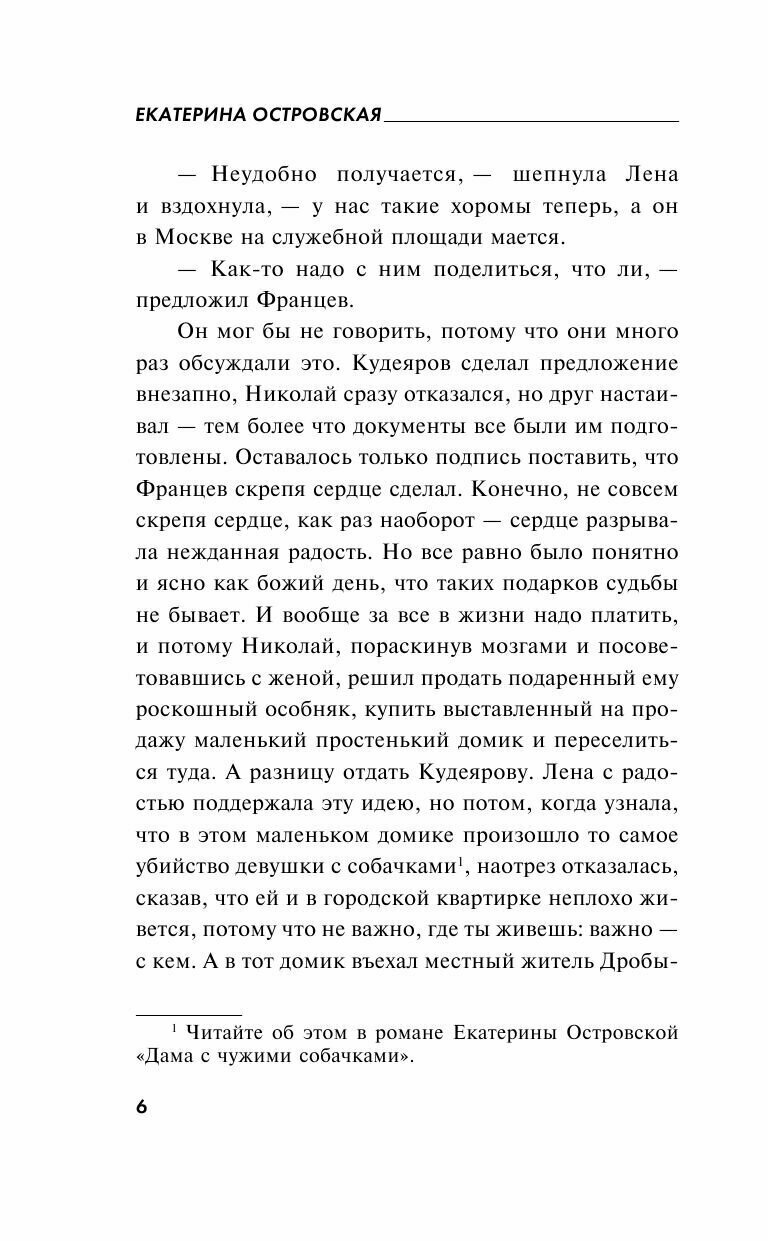 Татьяна Устинова рекомендует: «Екатерина Островская не просто выдумывает и записывает детективные истории. Она обладает редкой способностью создавать на страницах своих книг целые миры — завораживающие, таинственные, манящие, но будто бы чуточку ненастоящие. И эта невсамделишность идет произведениям только на пользу… А еще все книги Островской нравятся мне потому, что всю полноту власти над собственными выдуманными мирами Екатерина использует для восстановления справедливости наяву».