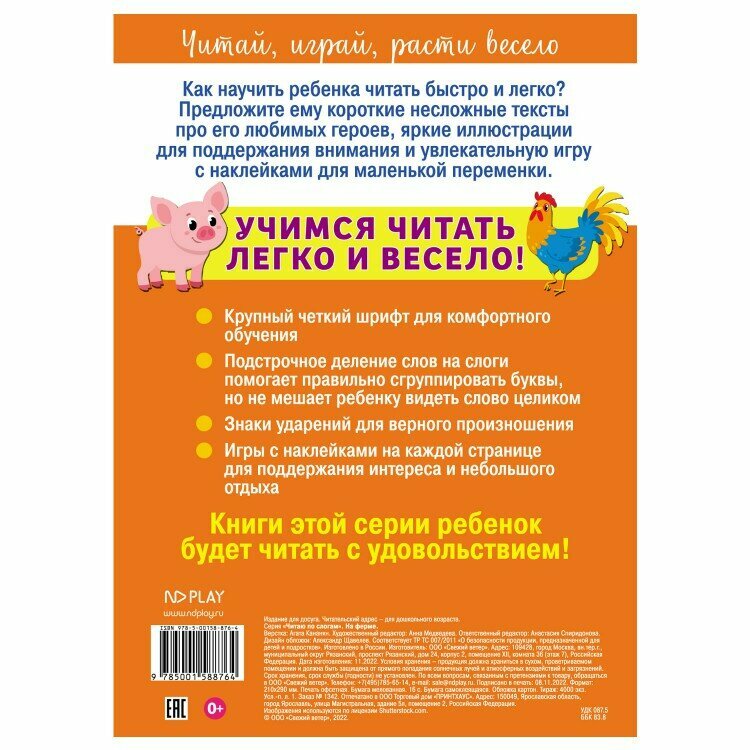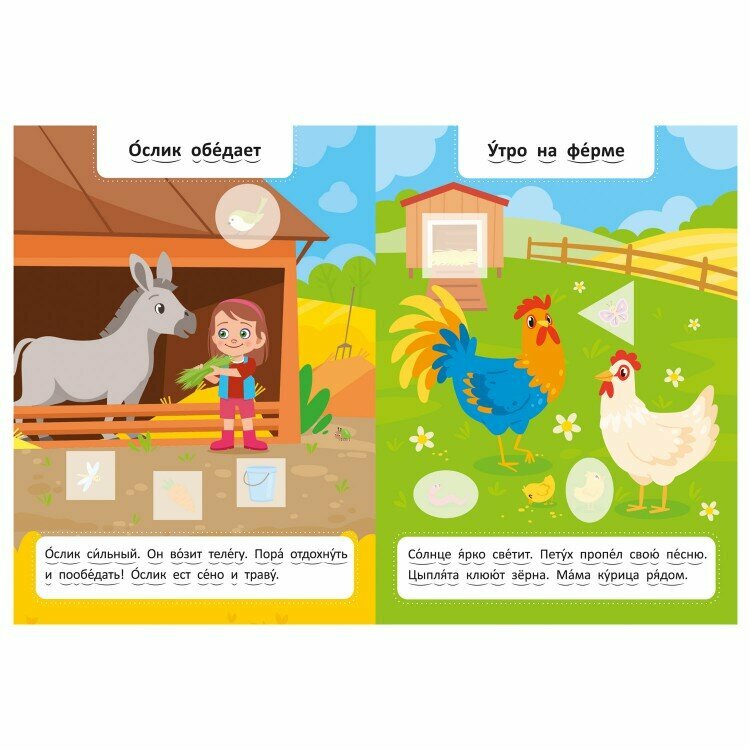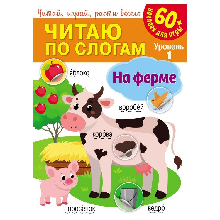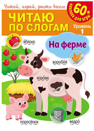 Как научить ребенка читать быстро и легко? Предложите ему короткие несложные тексты про любимых героев, яркие иллюстрации для поддержания внимания и увлекательную игру с наклейками. «Читаю по слогам» - серия книг, которая поможет ребенку научиться читать и постепенно улучшить этот навык. Развивающая книга «На ферме» 1 уровня состоит из коротких предложений и простых грамматических конструкций – по 2 строчки на каждой странице. Тексты отпечатаны крупным и четким шрифтом.Слова разделены по слогам подстрочными символами: такое деление помогает правильно сгруппировать буквы и не мешает видеть слово целиком. Ударения обозначены сверху, над каждым словом. Игры с геометрическими наклейками помогут отдохнуть и удержать интерес ребенка на занятии. В каждой книге – более 60 ярких наклеек. Книги предназначены для детей 4-6 лет.