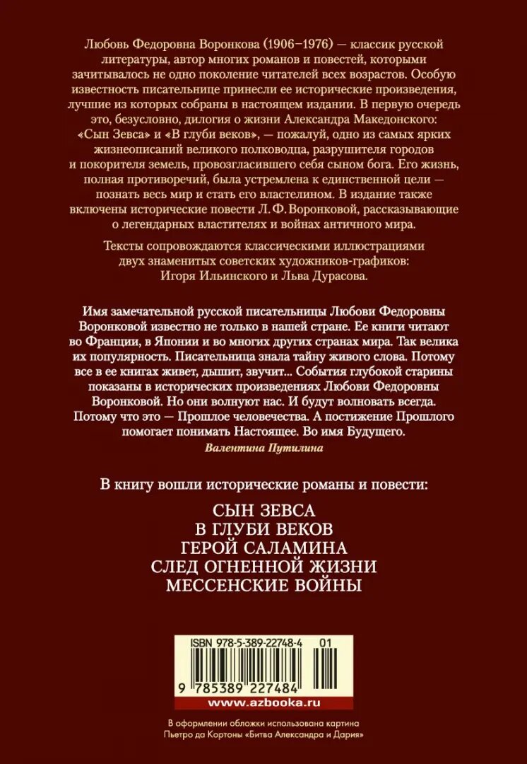 Любовь Федоровна Воронкова (1906–1976) — классик русской литературы, автор многих романов и повестей, которыми зачитывалось не одно поколение читателей всех возрастов. Особую известность писательнице принесли ее исторические произведения, лучшие из которых собраны в настоящем издании. В первую очередь это, безусловно, дилогия о жизни Александра Македонского: «Сын Зевса» и «В глуби веков», — пожалуй, одно из самых ярких жизнеописаний великого полководца, разрушителя городов и покорителя земель, провозгласившего себя сыном бога. Его жизнь, полная противоречий, была устремлена к единственной цели — познать весь мир и стать его властелином. В издание также включены исторические повести Л. Ф. Воронковой, рассказывающие о легендарных властителях и войнах античного мира.