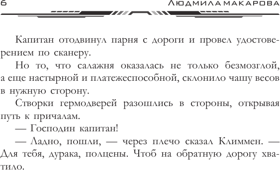 До этой книги был знаком с творчеством Л. Макаровой только по двум ее романам ,выходившим в серии "Дозоры, но это совсем другая история" (но кстати обе вещи тоже очень неплохие). Эта книга "открывает" цикл "Космолетчики", написанный в жанре космооперы. По моему мнению это один из лучших отечественных циклов в этом жанре. У нас вообще космооперы издаются не так часто, а добротные "читаемые" вещи -это вообще большая редкость. Как обычно не буду пересказывать содержание ,кому такая фантастика интересна прочтут сами и сделают свои выводы. Могу лишь только порекомендовать весь цикл (три книги) к покупке ,здесь все романы по качеству и продуманности сюжета, закрученности интриги и прочая прочая не уступают друг другу. Все ГГ индивидуальны, обладают вполне реальными сильными и слабыми чертами характера ,то есть это совсем не супермены со стальными мускулами и взглядом, которые всегда все знают ,все умеют и могут, и на белом коне лихо преодолевая все преграды ,без единой царапины оказываются на верху пьедестала. Здесь как и в жизни, любая победа достаётся очень высокой ценой, часто потерей друзей. В общем книги держат читателя в постоянном напряжении, интриге и сопереживании. В общем читайте и получайте удовольствие! Очень жаль ,что такой талантливый ( на мой взгляд ) автор так мало издается. Кроме выше перечисленных ,в 2017г в цикле "Тайный город" выходил написанный в соавторстве с Пеховым роман ,но я этот цикл не покупал и соответственно про книгу Макаровой ничего сказать не могу.