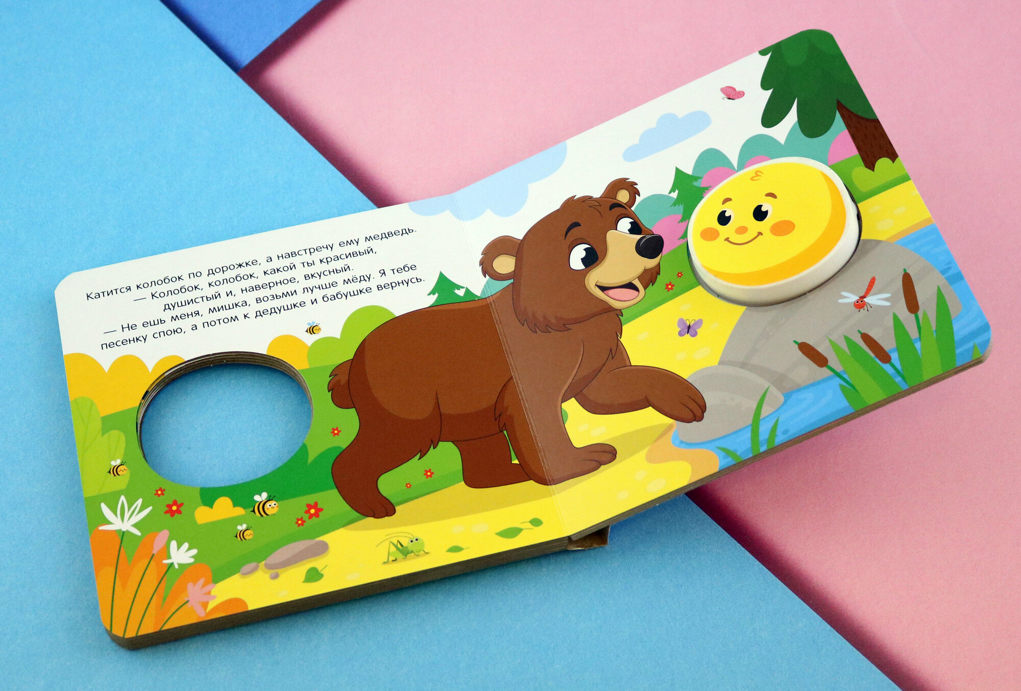 Что ж, начну с плюсов этой книги. Первое, это чудесная милая вставка Колобка из резины и с пищалкой. Это очень сильно привлекает ребёнка и сын может играться с ней хоть весь день. Также яркие и красивые иллюстрации, понятный и крупный шрифт, чтобы не портить зрение деткам.