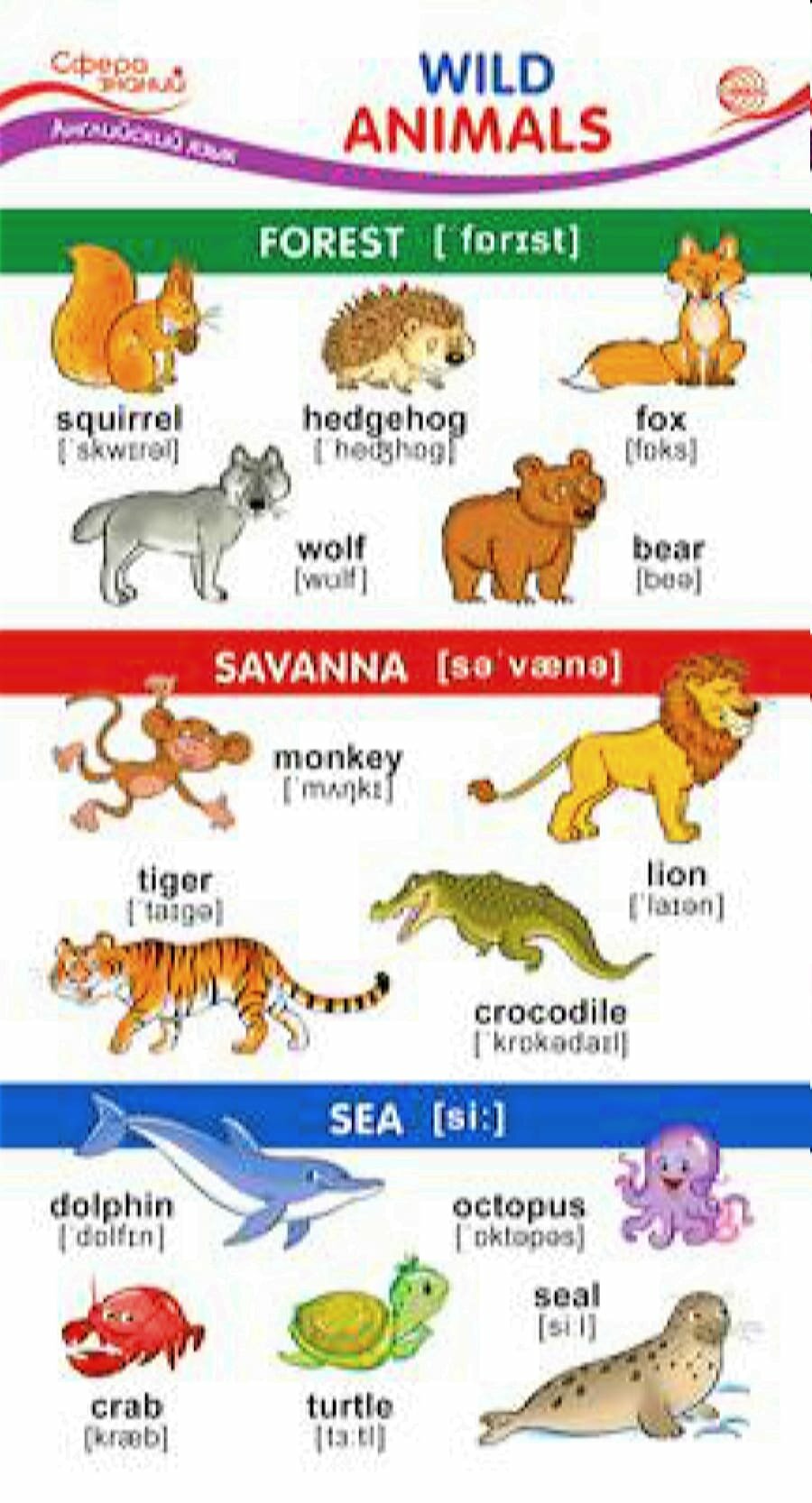 Карточка-шпаргалка поможет быстро и наглядно изучить названия диких животных. Дикие животные представлены обитателями леса, саванны, моря. На обороте даны задания для закрепления материала. Карточку можно использовать в качестве закладки.
