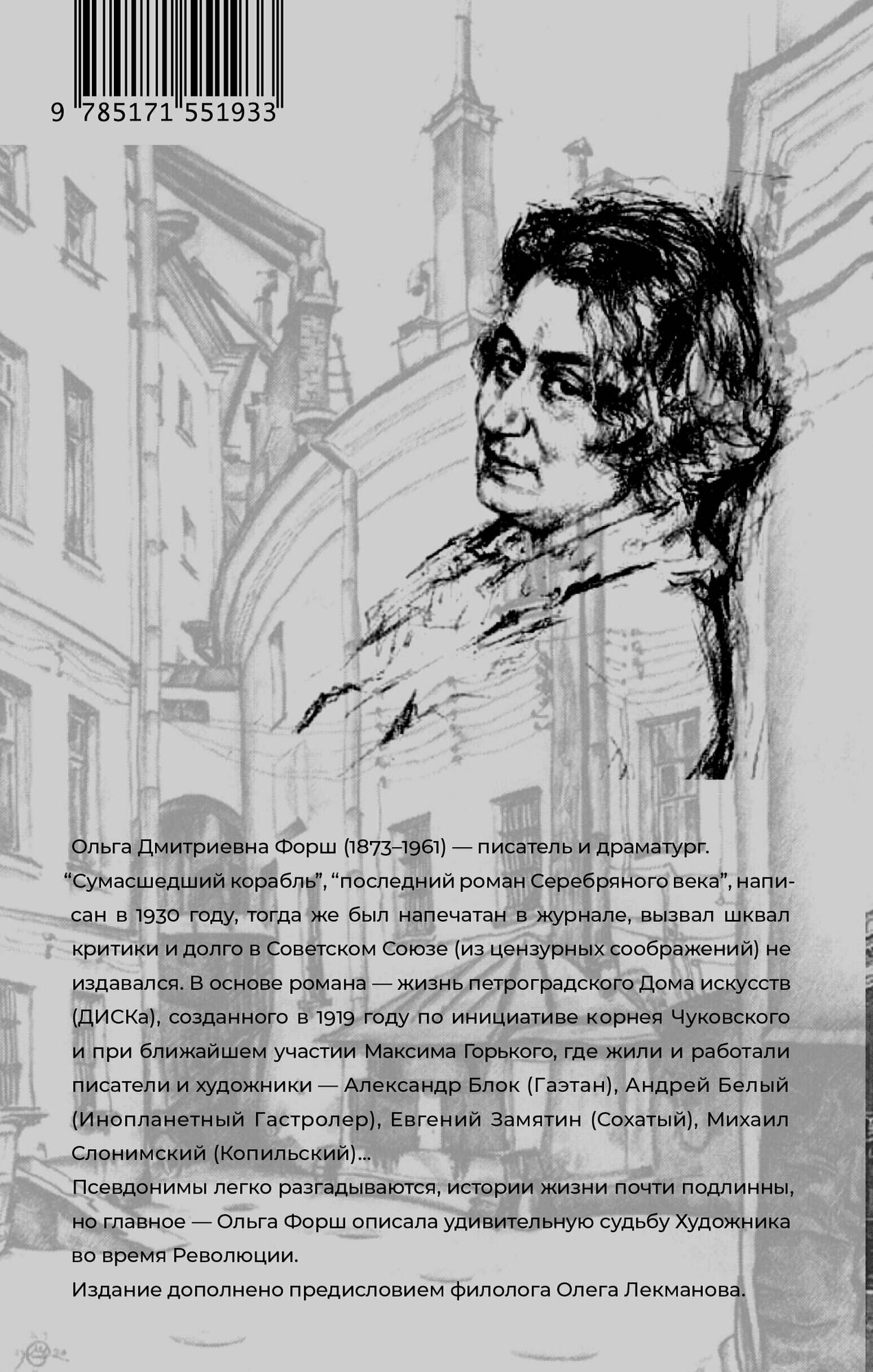 “Сумасшедший корабль”, “последний роман Серебряного века”, написан в 1930 году, тогда же был напечатан в журнале, вызвал шквал критики и долго в Советском Союзе (из цензурных соображений) не издавался. В основе романа — жизнь петроградского Дома искусств (ДИСКа), созданного в 1919 году по инициативе Корнея Чуковского и при ближайшем участии Максима Горького, где жили и работали писатели и художники — Александр Блок (Гаэтан), Андрей Белый (Инопланетный Гастролер), Евгений Замятин (Сохатый), Михаил Слонимский (Копильский)... Псевдонимы легко разгадываются, истории жизни почти подлинны, но главное — Ольга Форш описала удивительную судьбу Художника во время Революции.