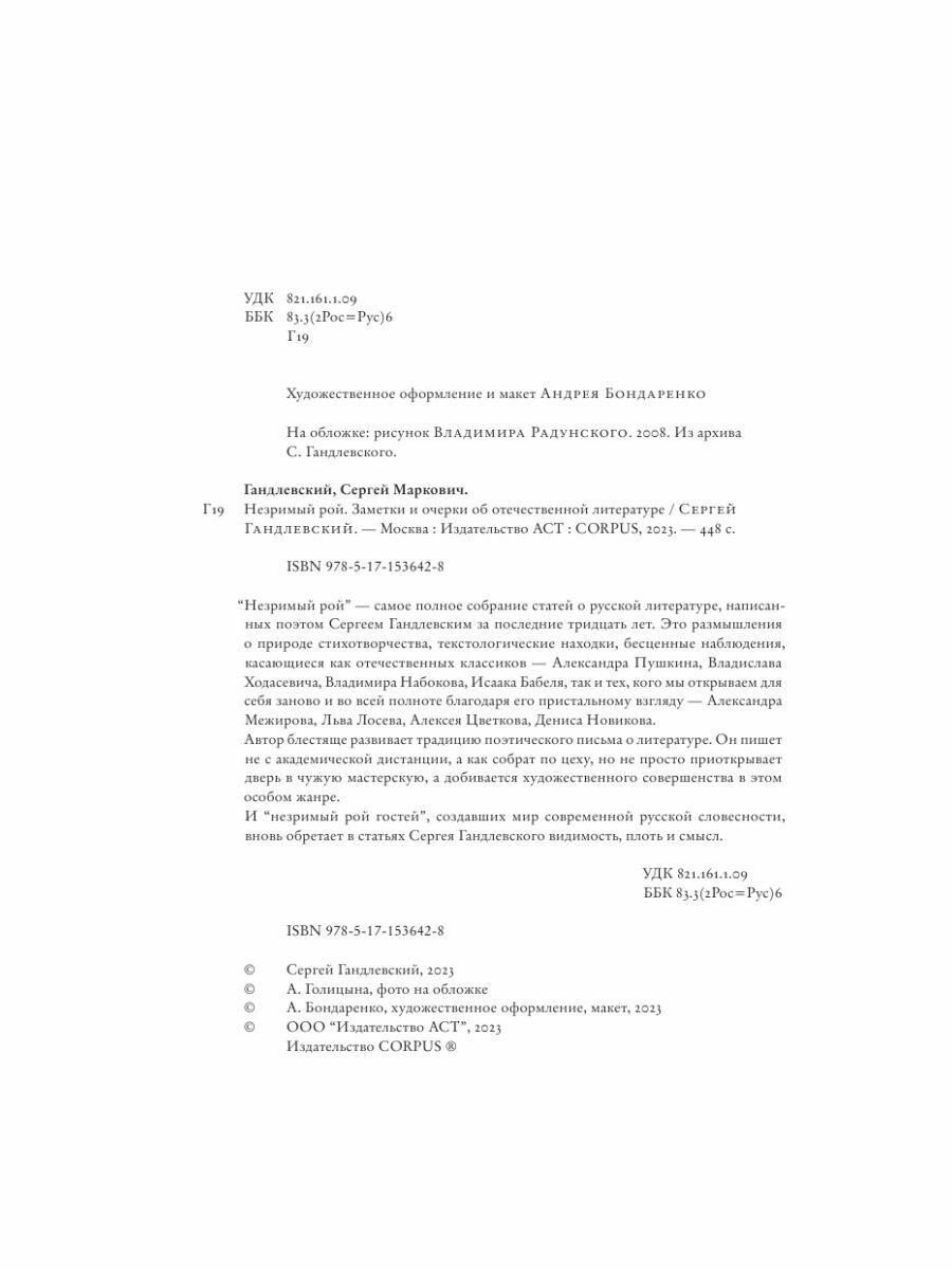 "Незримый рой" - самое полное собрание статей о русской литературе, написанных поэтом Сергеем Гандлевским за последние тридцать лет. Это размышления о природе стихотворчества, текстологические находки, бесценные наблюдения, касающиеся как отечественных классиков - Александра Пушкина, Владислава