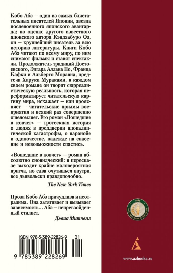 Кобо Абэ — один из самых блистательных писателей Японии, звезда послевоенного японского авангарда; по оценке другого известного японского автора Кэндзабуро Оэ, он — крупнейший писатель за всю историю литературы. Книги Кобо Абэ читают по всему миру, по ним снимают фильмы и ставят спектакли. Продолжатель традиций Достоевского, Эдгара Аллана По, Франца Кафки и Альберто Моравиа, предтеча Харуки Мураками, в каждом своем романе он творит сюрреалистическую реальность, которая переформатирует читательскую картину мира, искажает — или проясняет — читательские призмы восприятия и всякий раз совершенно ошеломляет. Его роман «Вошедшие в ковчег» — гротескная история о людях в преддверии апокалиптической катастрофы, о паранойе и одиночестве, надежде на спасение и невозможности спастись.