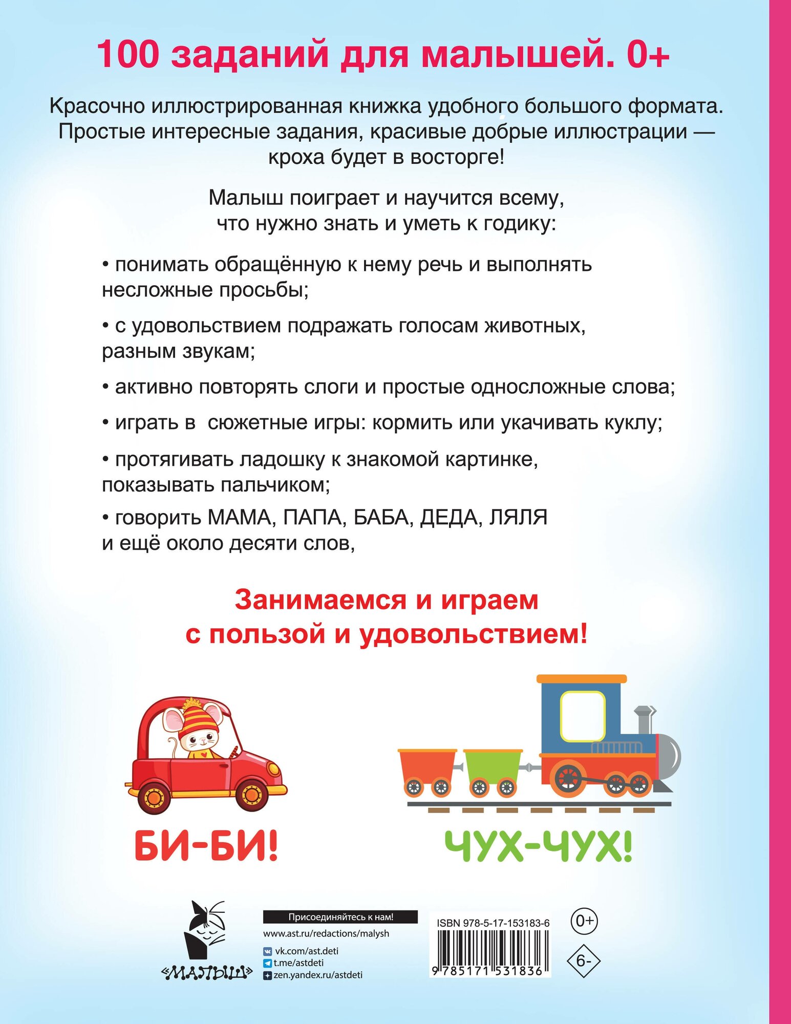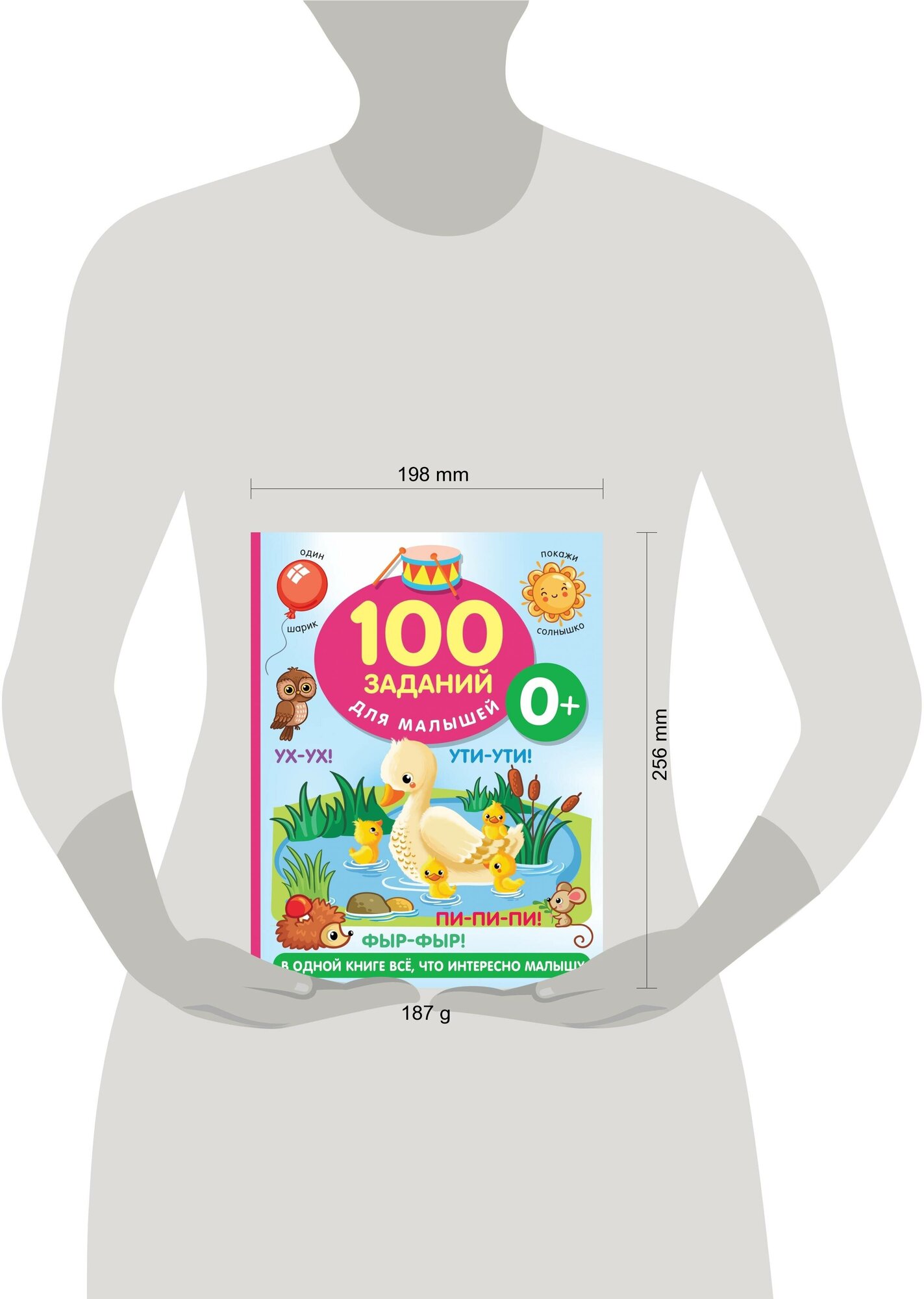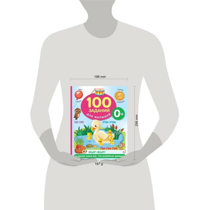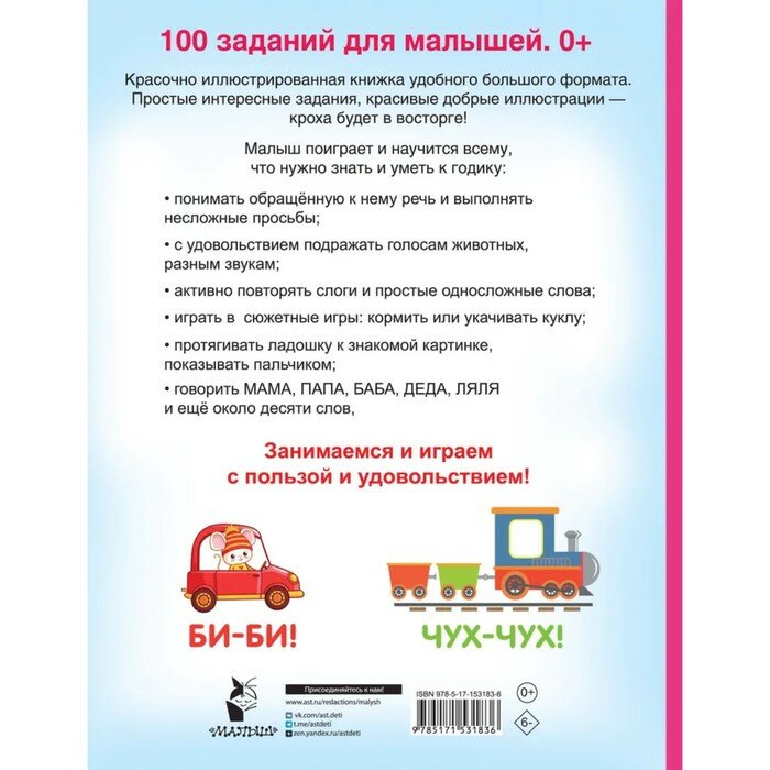 Прекрасно иллюстрированная книжка "100 заданий для малыша. 0+" — идеальное развивающее пособие для самых маленьких. Яркие и забавные картинки интересно рассматривать вместе с ребёнком. Любознательный кроха потренирует пальчики, с удовольствием будет слушать и повторять знакомые звукоподражания, выучит новые слова и освоит полезные навыки общения. Много-много интересных игр и заданий — ни одной скучной страницы!