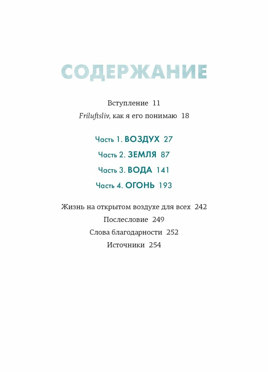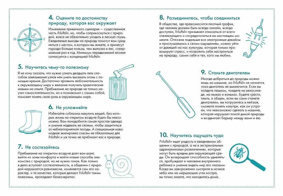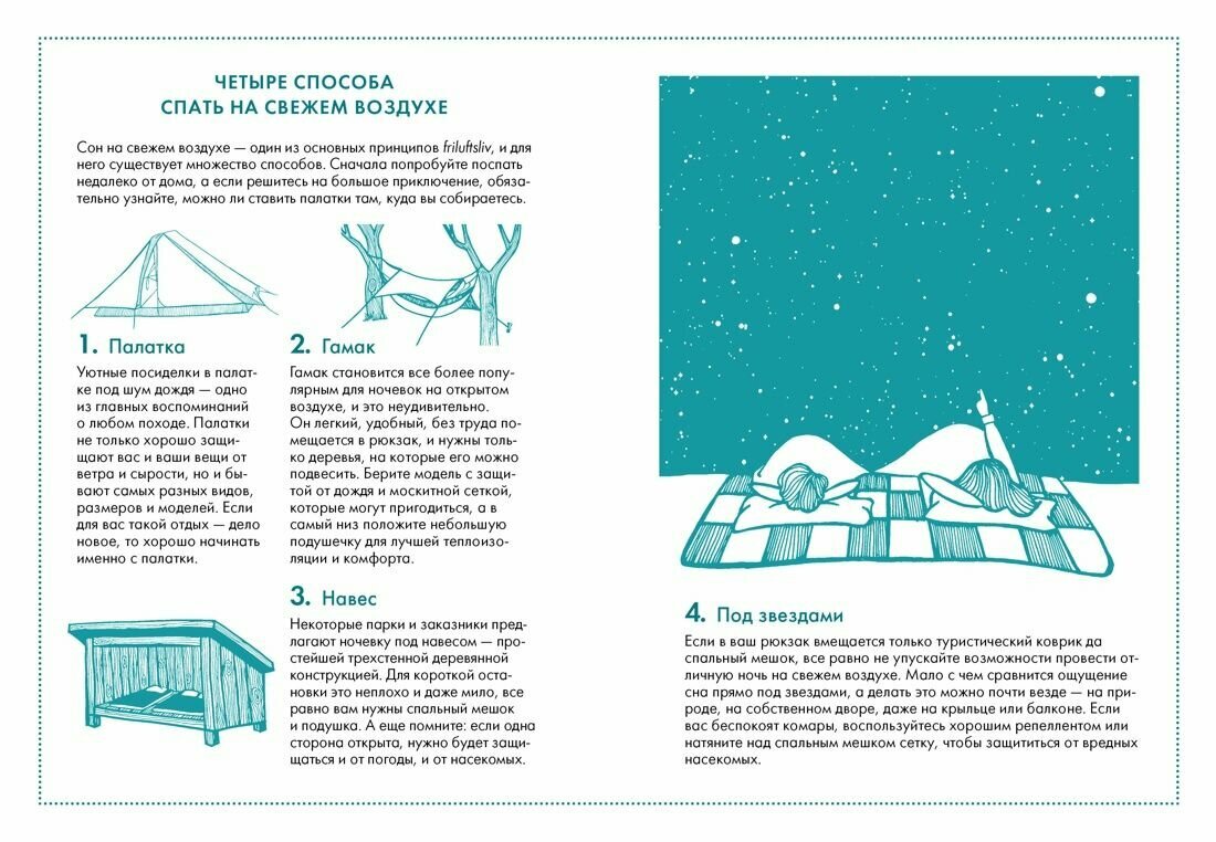 "Friluftsliv, или пребывание на открытом воздухе, - это встреча природы и человека и то ценное, что мы в это время создаем; проще говоря, выстраивание личных отношений с природой через прямое взаимодействие. Какой способ выбрать, решайте сами. Friluftsliv может быть совсем незамысловатым, как вечерняя прогулка по окрестностям, или очень продвинутым, как многодневный поход с рюкзаком в далекие и дикие места, может быть чем-то средним между тем и другим. Можно наслаждаться им в одиночестве, можно с друзьями или семьей, а можно и в компании единомышленников. Это знакомство с природой, но без расписания и теоретических занятий в классе. Это практика, передача знаний и полезных навыков от одной встречи к другой, от одного поколения к другому". (Линда Окесон-Макгёрк)