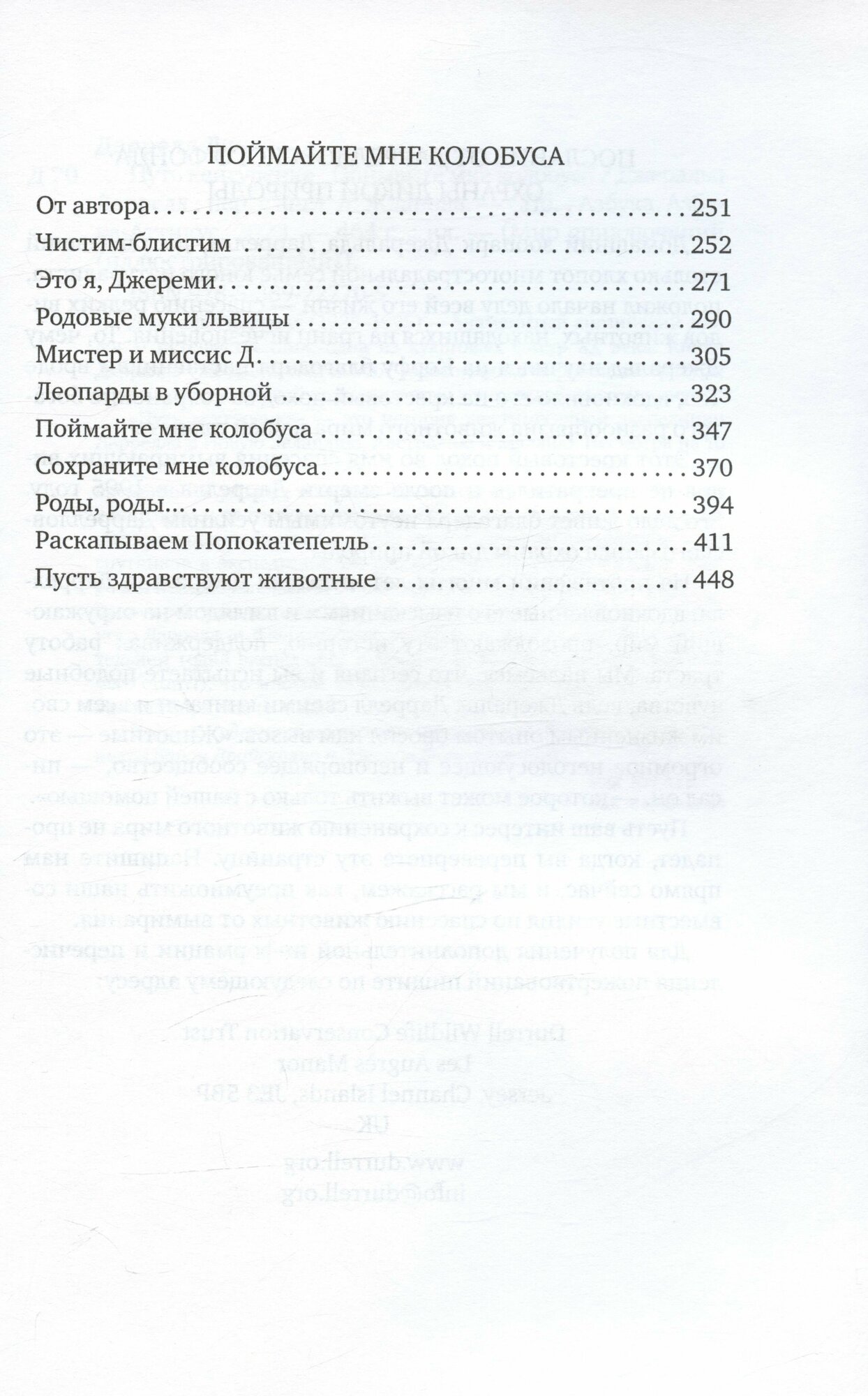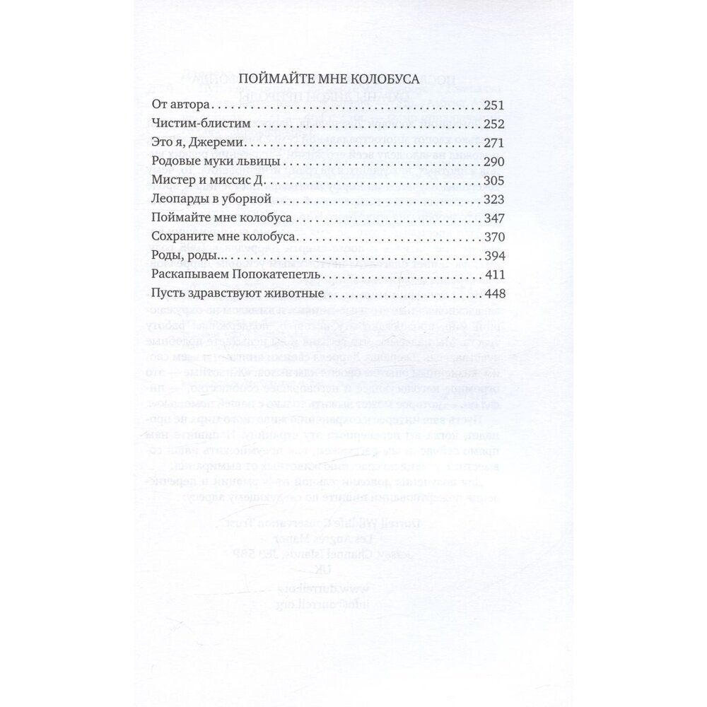 «Путь кенгуренка» — это история шестимесячной экспедиции Даррелла в Новую Зеландию, Австралию и Малайю. Несмотря на то что путешественники провели в каждой из стран не так уж и много времени, им удалось познакомиться с невероятным разнообразием животного и растительного мира островных государств. О том, какие трудности и открытия ждали прославленного натуралиста и его спутников в экспедиции, он рассказывает с неподражаемым юмором и исследовательской точностью. Повесть «Поймайте мне колобуса» представляет собой зарисовки из жизни сотрудников созданного Дарреллом Джерсийского зоопарка — жизни настолько удивительной (одна экспедиция в Африку за леопардами и обезьянами чего стоит!), что многим из нас она покажется невероятно захватывающим приключением.