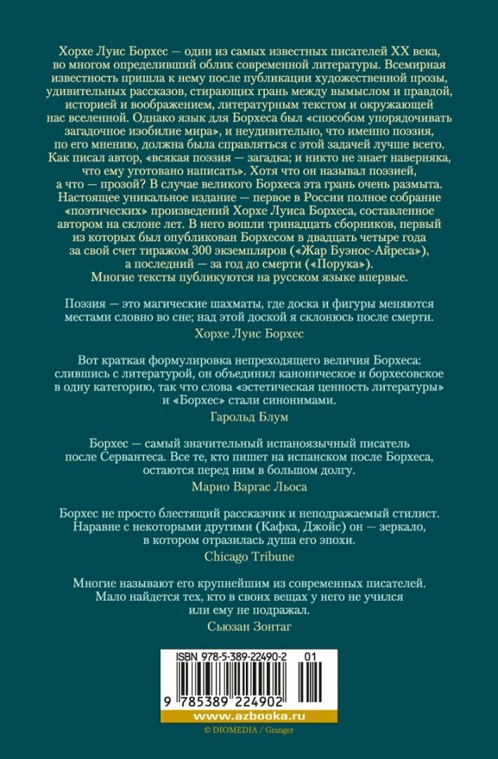 Хорхе Луис Борхес — один из самых известных писателей ХХ века, во многом определивший облик современной литературы. Всемирная известность пришла к нему после публикации художественной прозы, удивительных рассказов, стирающих грань между вымыслом и правдой, историей и воображением, литературным текстом и окружающей нас вселенной. Однако язык для Борхеса был «способом упорядочивать загадочное изобилие мира», и неудивительно, что именно поэзия, по его мнению, должна была справляться с этой задачей лучше всего. Как писал автор, «всякая поэзия — загадка; и никто не знает наверняка, что ему уготовано написать». Хотя что он называл поэзией, а что — прозой? В случае великого Борхеса эта грань очень размыта. Настоящее уникальное издание — первое в России полное собрание «поэтических» произведений Хорхе Луиса Борхеса, составленное автором на склоне лет. В него вошли тринадцать сборников, первый из которых был опубликован Борхесом в двадцать четыре года за свой счет тиражом 300 экземпляров («Жар Буэнос-Айреса»), а последний — за год до смерти («Порука»). Многие тексты публикуются на русском языке впервые.