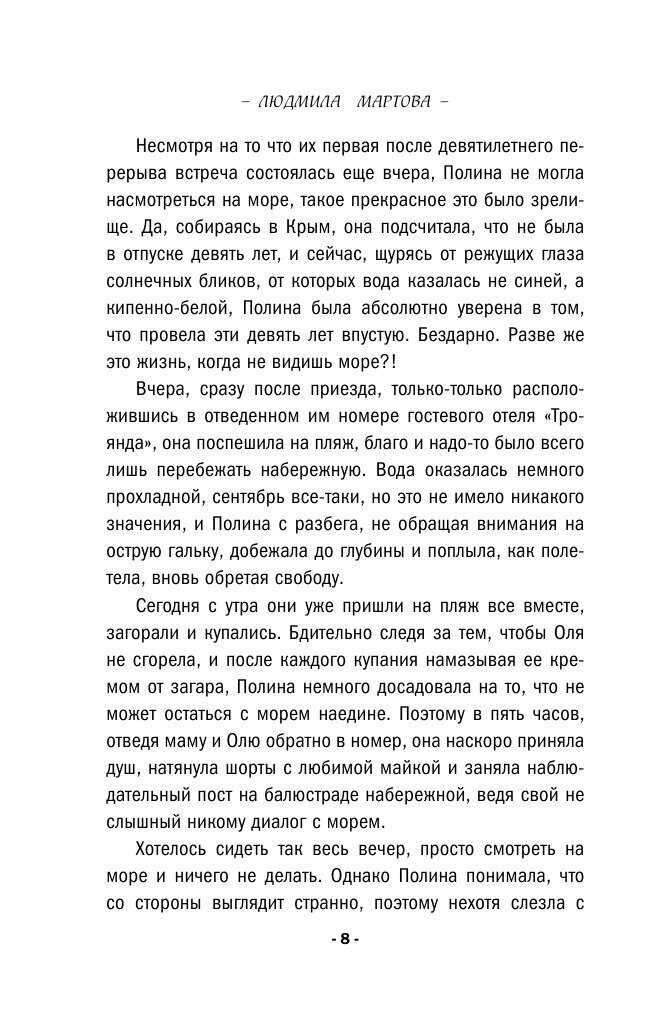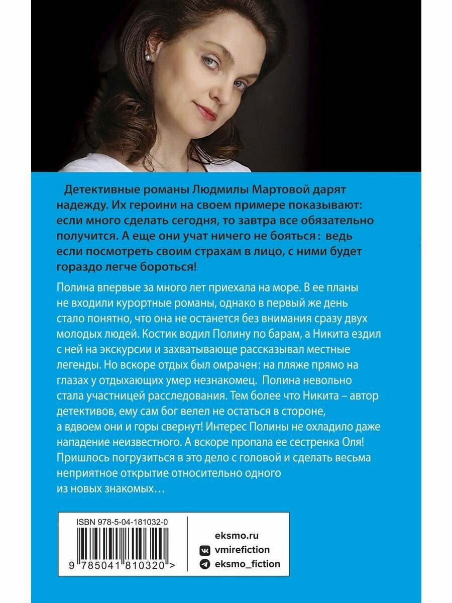 Полина впервые за много лет приехала на море. В ее планы не входили курортные романы, однако в первый же день стало понятно, что она не останется без внимания сразу двоих молодых людей. Костик водил Полину по барам, а Никита ездил с ней на экскурсии и захватывающе рассказывал местные легенды. Однако вскоре отдых был омрачен - на пляже прямо на глазах у отдыхающих умер незнакомец, и Полина невольно стала участницей расследования. Тем более что Никита - автор детективов, ему сам бог велел не остаться в стороне, а вдвоем они и горы свернут! Интерес Полины не остановило даже нападение неизвестного. А вскоре пропала ее сестренка Оля! Пришлось погрузиться в это дело с головой и сделать весьма неприятное открытие относительно одного из новых знакомых…