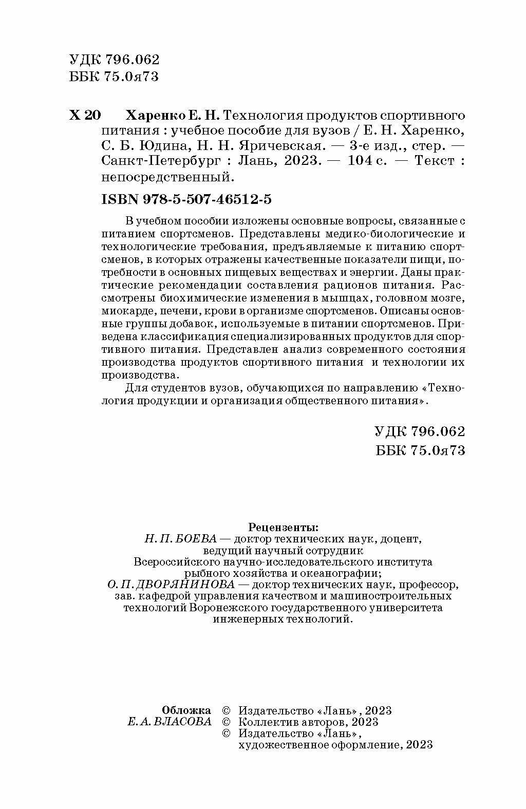 Технология продуктов спортивного питания. Учебное пособие для вузов (Яричевская Наталия Николаевна, Юдина Светлана Борисовна, Харенко Елена Николаевна); Лань, 2023