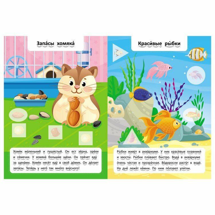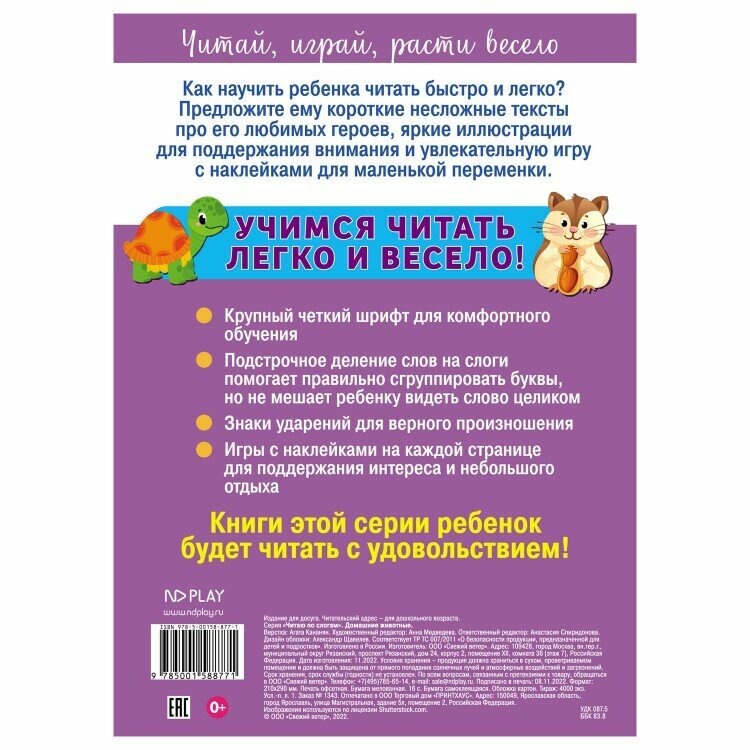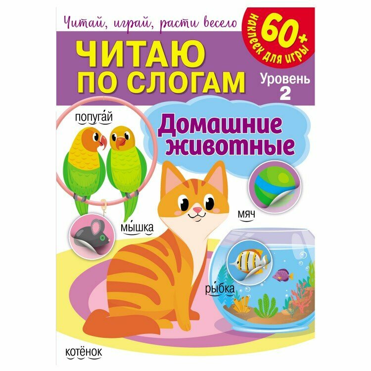 Как научить ребенка читать быстро и легко? Предложите ему короткие несложные тексты про любимых героев, яркие иллюстрации для поддержания внимания и увлекательную игру с наклейками. «Читаю по слогам» - серия книг, которая поможет ребенку научиться читать и постепенно улучшить этот навык. Развивающая книга «Домашние животные» 2 уровня состоит из простых текстов с короткими предложениями – по 4 строчки на каждой странице. Тексты отпечатаны крупным и четким шрифтом. Слова разделены по слогам подстрочными символами: такое деление помогает правильно сгруппировать буквы и не мешает видеть слово целиком. Ударения обозначены сверху, над каждым словом. Игры с геометрическими наклейками помогут отдохнуть и удержать интерес ребенка на занятии. В каждой книге – более 60 ярких наклеек. Книги предназначены для детей 4-6 лет.