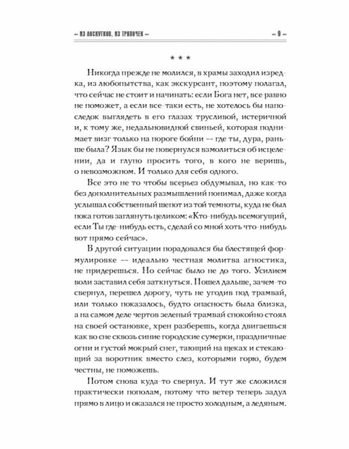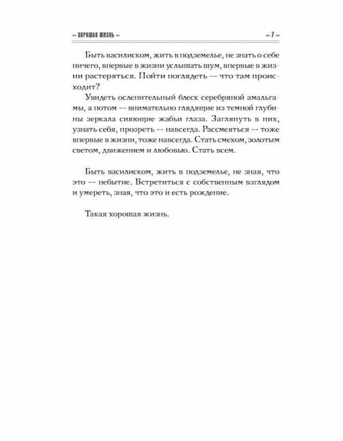 «Быть василиском-сиротой, с младенчества лишенным присутствия старших, а значит, знаний о себе и об окружающем мире, которые они могли бы передать. Жить в подземелье, есть драгоценные камни, не знать о себе ничего — ни о птичьей голове, ни о змеином хвосте, ни о прекрасных жабьих глазах, ни о способности убивать взглядом, ни о смертельной опасности, которую сулит петушиный крик. Думать, что тьма пещеры — это и есть весь мир, а огненный хохолок на твоей макушке — единственное светило. Быть вполне довольным таким мироустройством — все на месте, ничего лишнего, да и сравнивать не с чем...»