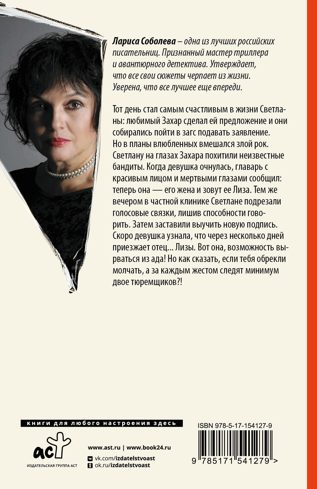 Тот день стал самым счастливым в жизни Светланы: любимый Захар сделал ей предложение и они собирались пойти в загс подавать заявление. Но в планы влюбленных вмешался злой рок. Светлану на глазах Захара похитили неизвестные бандиты. Когда девушка очнулась, главарь с красивым лицом и мертвыми глазами сообщил: теперь она - его жена и зовут ее Лиза. Тем же вечером в частной клинике Светлане подрезали голосовые связки, лишив способности говорить. Затем заставили выучить новую подпись. Скоро девушка узнала, что через несколько дней приезжает отец… Лизы. Вот она, возможность вырваться из ада! Но как сказать, если тебя обрекли молчать, а за каждым жестом следят минимум двое тюремщиков?!
