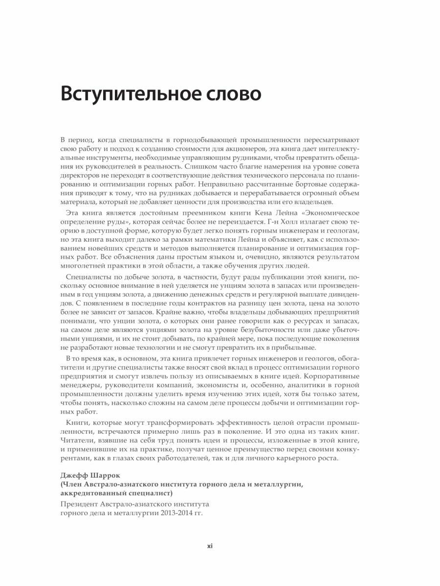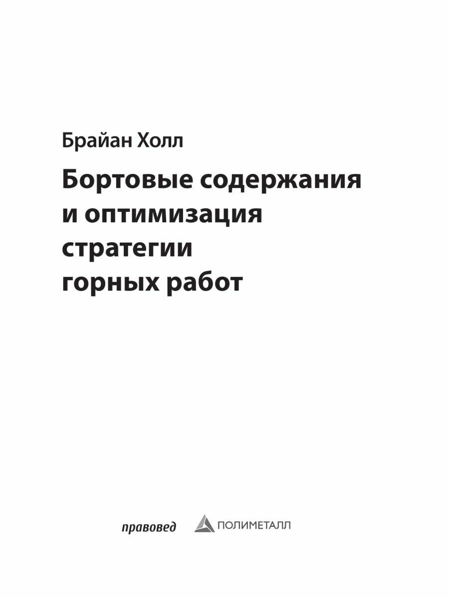 Российские читатели с выходом этой книги впервые получают возможность подробно ознакомиться с развитием теории бортового содержания и горных стратегий, что, к сожалению, пока не пользуется должным вниманием в России. Между тем, именно такие подходы наиболее востребованы в современном профессиональном сообществе. Книга будет полезной ведущим специалистам инжиниринговых организаций и горнодобывающих компаний, а также ученым, занимающимся оптимизацией горных систем, аспирантам и студентам горных вузов.
