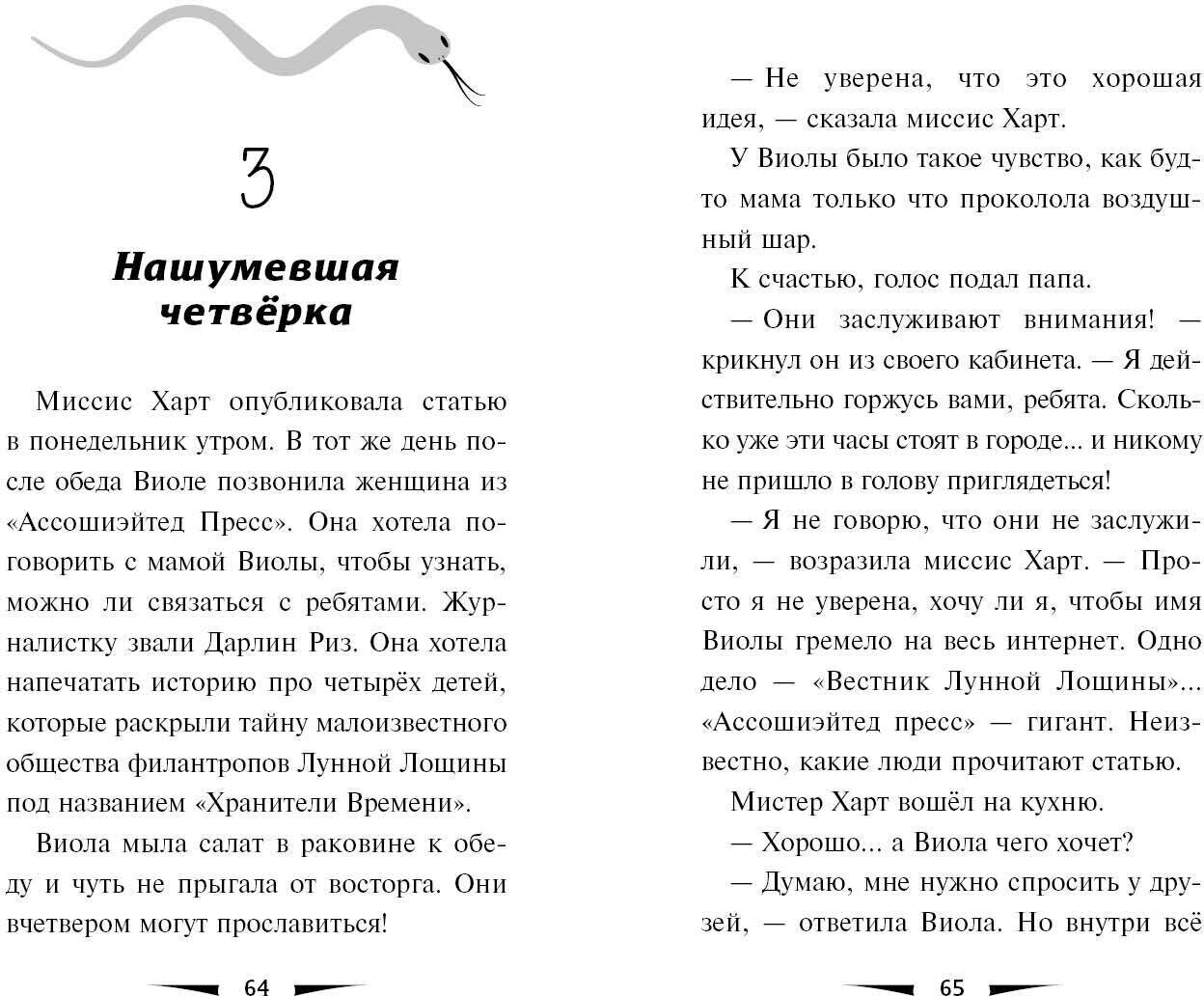 Часы перед библиотекой Лунной Лощины стоят с незапамятных времён. Никто и не задумывался, как они здесь оказались, пока в город не переселилась Виола Харт. А ведь эти часы таят в себе много тайн! Почему минутная стрелка резко перепрыгивает на пять минут вперёд? Зачем на них картинки? И сколько в городке ещё похожих часов?