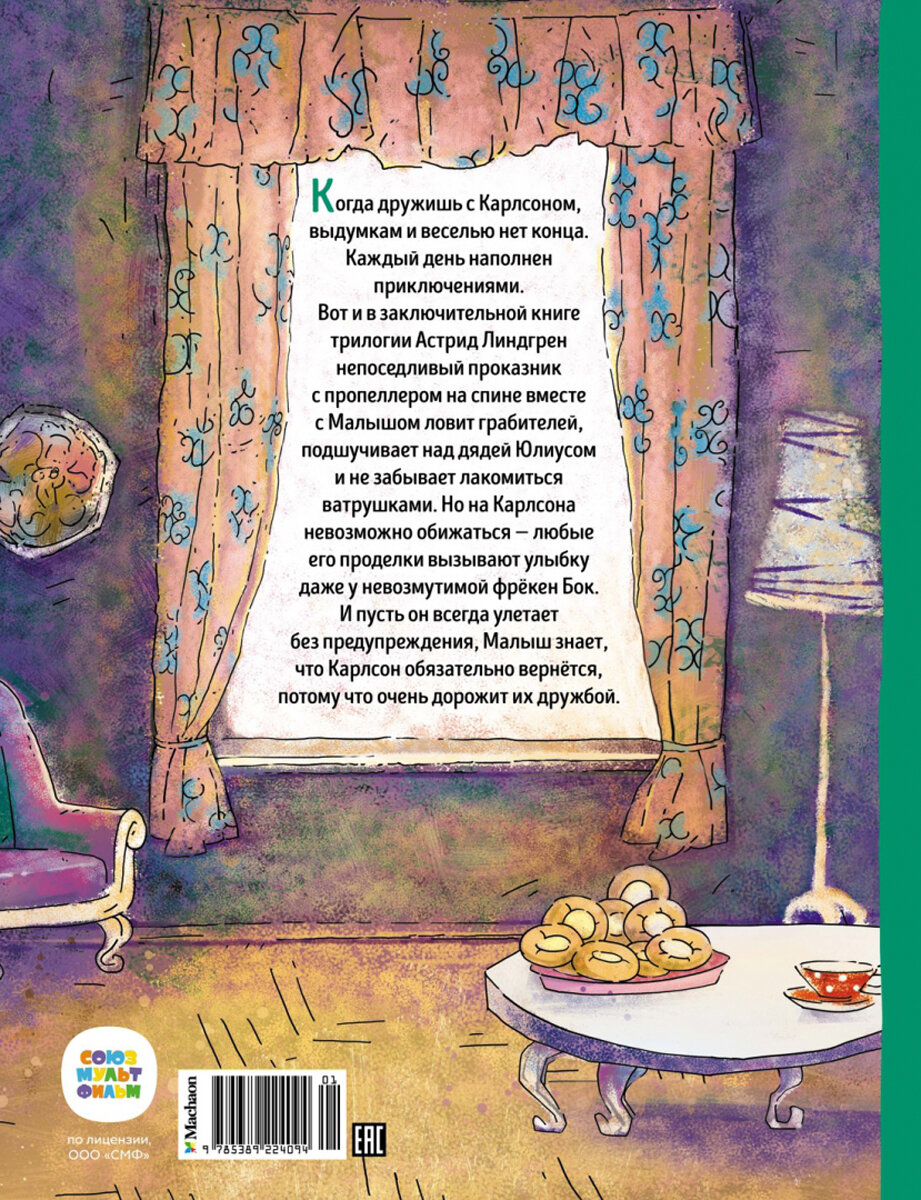 Когда дружишь с Карлсоном, выдумкам и веселью нет конца. Каждый день наполнен приключениями. Вот и в заключительной книге трилогии Астрид Линдгрен непоседливый проказник с пропеллером на спине вместе с Малышом ловит грабителей, подшучивает над дядей Юлиусом и не забывает лакомиться ватрушками. Но на Карлсона невозможно обижаться – любые его проделки вызывают улыбку даже у невозмутимой фрёкен Бок. И пусть он всегда улетает без предупреждения, Малыш знает, что Карлсон обязательно вернётся, потому что очень дорожит их дружбой.