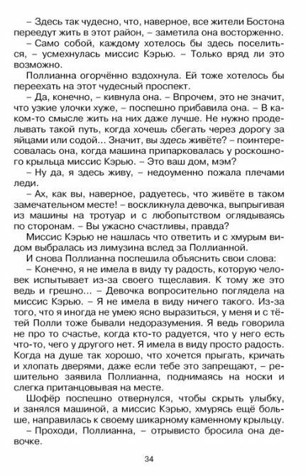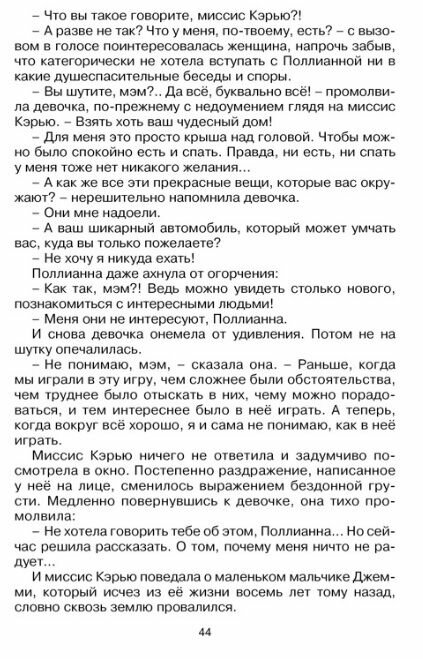 Вот и я увидела, что у «Поллианы» есть продолжение. Честно говоря, ожидала большее. Сюжет очень предсказуемый, но от этого читать не менее приятно. Безумно добрая история о девочке. Во время прочтения можно увидеть то, как происходит взросление героини: у неё появляются новые, взрослые мысли. Я люблю эту историю и советую прочитать всем девочкам и мальчикам. Рекомендую возраст до 10 лет, но читать никогда не поздно