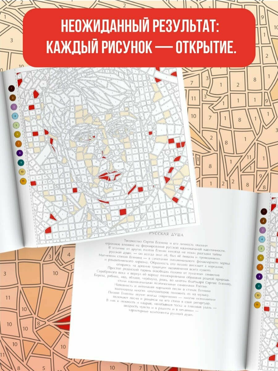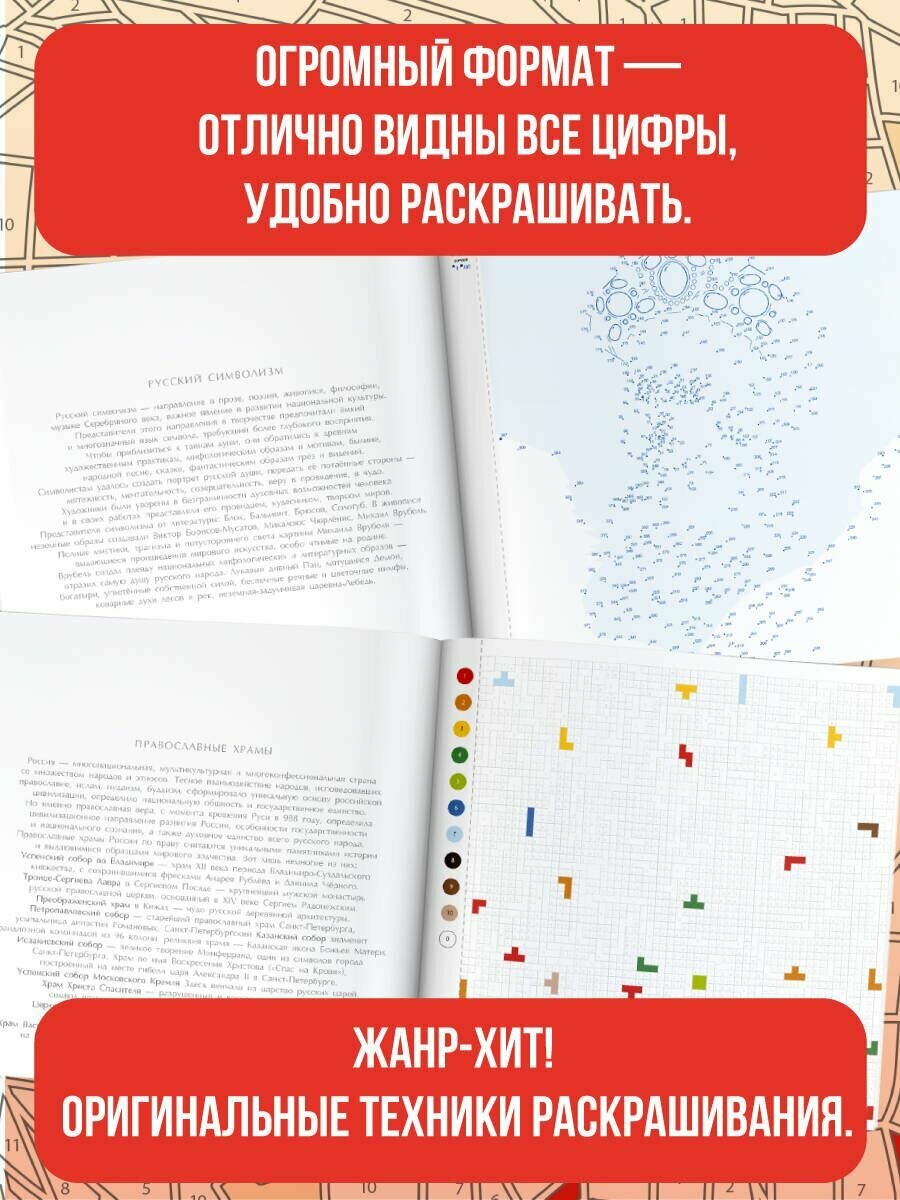 Этот творческий альбом объединяет несколько увлекательных жанров раскрашивания. На каждой странице вас ждут различные задания-квесты с непредсказуемым ярким результатом. Пока задание не пройдено — сюжеты и колорит картин остаются загадкой. Более 20 сюжетов альбома посвящены культурному наследию, традициям и символам России. Вы раскрасите по номерам, пикселям и соедините по точкам архитектурные памятники, шедевры русской живописи и прикладного искусства, а также портреты выдающихся людей, чьи достижения сделали нашу страну великой.