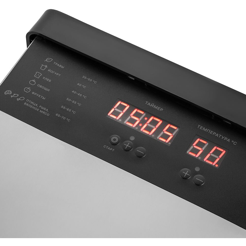 | Прочие особенности и свойства | На сушилке можно установить температуру сушки в диапазоне 30–70 °С с шагом 1 °С. Таймер регулируется до 40 часов 59 мин работы с шагом 1 ч. На панели указаны рекомендации по сушке разных продуктов.В сушилке установлен мощный нагревательный элемент и вентилятор с лопостями большого диаметра., В комплекте с сушилкой идут 10 металлических сетчатых поддонов., Размер поддонов 365 х 295 мм. |