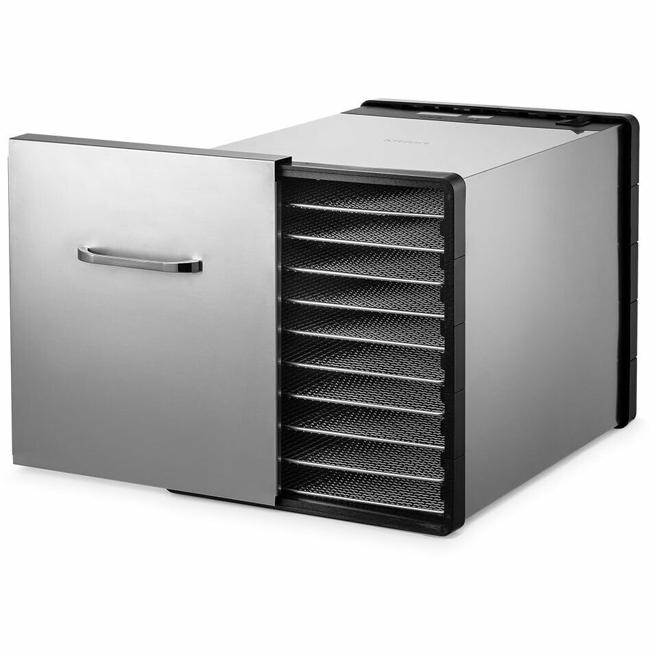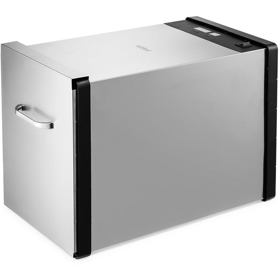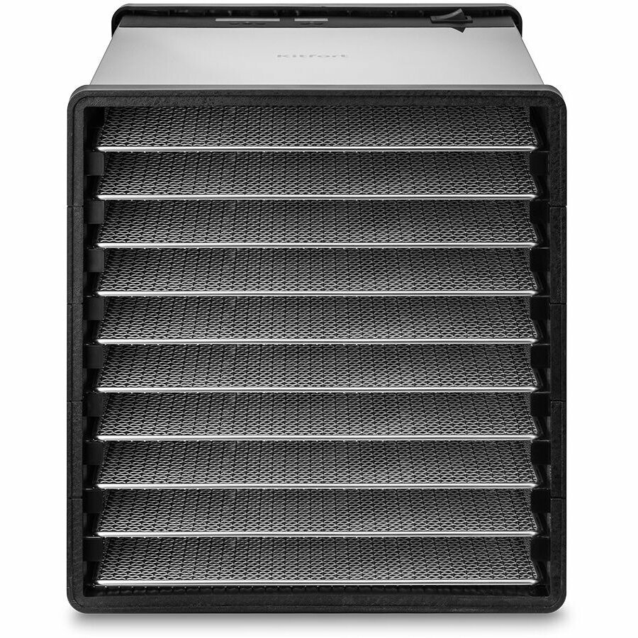 С металлической электрической сушилкой для фруктов и овощей KT-1924 у вас под рукой будет всегда живая еда. Прибор насушит на всю зиму овощи, фрукты, ягоды, грибы, корнеплоды, зелень, хлеб, а также мясо, птицу и рыбу. На сушилке можно установить температуру сушки в диапазоне 30–70 °С с шагом 1 °С. Таймер регулируется до 40 часов 59 мин работы с шагом 1 ч. На панели указаны рекомендации по сушке разных продуктов. В сушилке установлен мощный нагревательный элемент и вентилятор с лопостями большого диаметра. Это обеспечивает равномерный горизонтальный обдув всех 10 поддонов. Таким образом запахи продуктов с разных поддонов не смешиваются. В комплекте с сушилкой идут 10 металлических сетчатых поддонов.