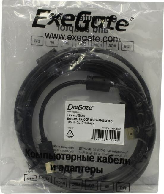 Кабель интерфейсный USB 2.0 Exegate EX138947RUS Am/Bm 3м 2 фильтра EX-CCF-USB2-AMBM-3.0