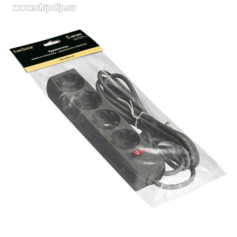 Удлинитель Exegate EX279398RUS 4 евророзетки с заземлением 5м защита от перегрузки выключатель с подсветкой черный EC-4-5B