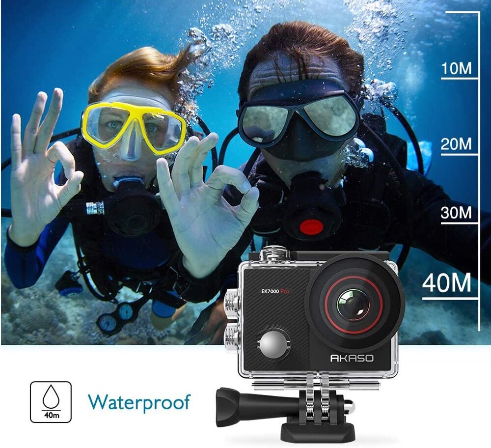 | Комплект поставки | 1x AKASO EK7000 Pro Action Camera, 1x Пульт управления, 1x ЗУ для аккумуляторов, 2x 1050 мАч аккумуляторы, 1x Влагозащищенный чехол, 1x Крепление для велосипеда, 7x различных креплений, 2x Фиксаторы, 2x Крепления для шлема, 1x Ремешок, 5x Стяжки, 1 x Защитная задняя крышка, 1x microUSB кабель, 1x Тряпочка для протирки линзы, 1x Quick Reference Guide |