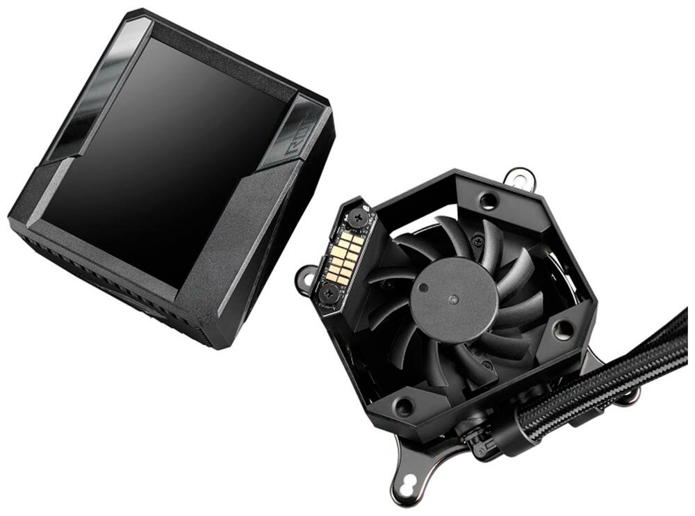 лишена ограничений традиционных жидкостных систем охлаждения благодаря встроенному в корпус помпы 60-мм вентилятору, который создает поток воздуха в области процессорного разъема. Этот вентилятор способствует снижению температуры компонентов материнской платы, в частности элементов системы питания процессора и накопителя в слоте M.2.