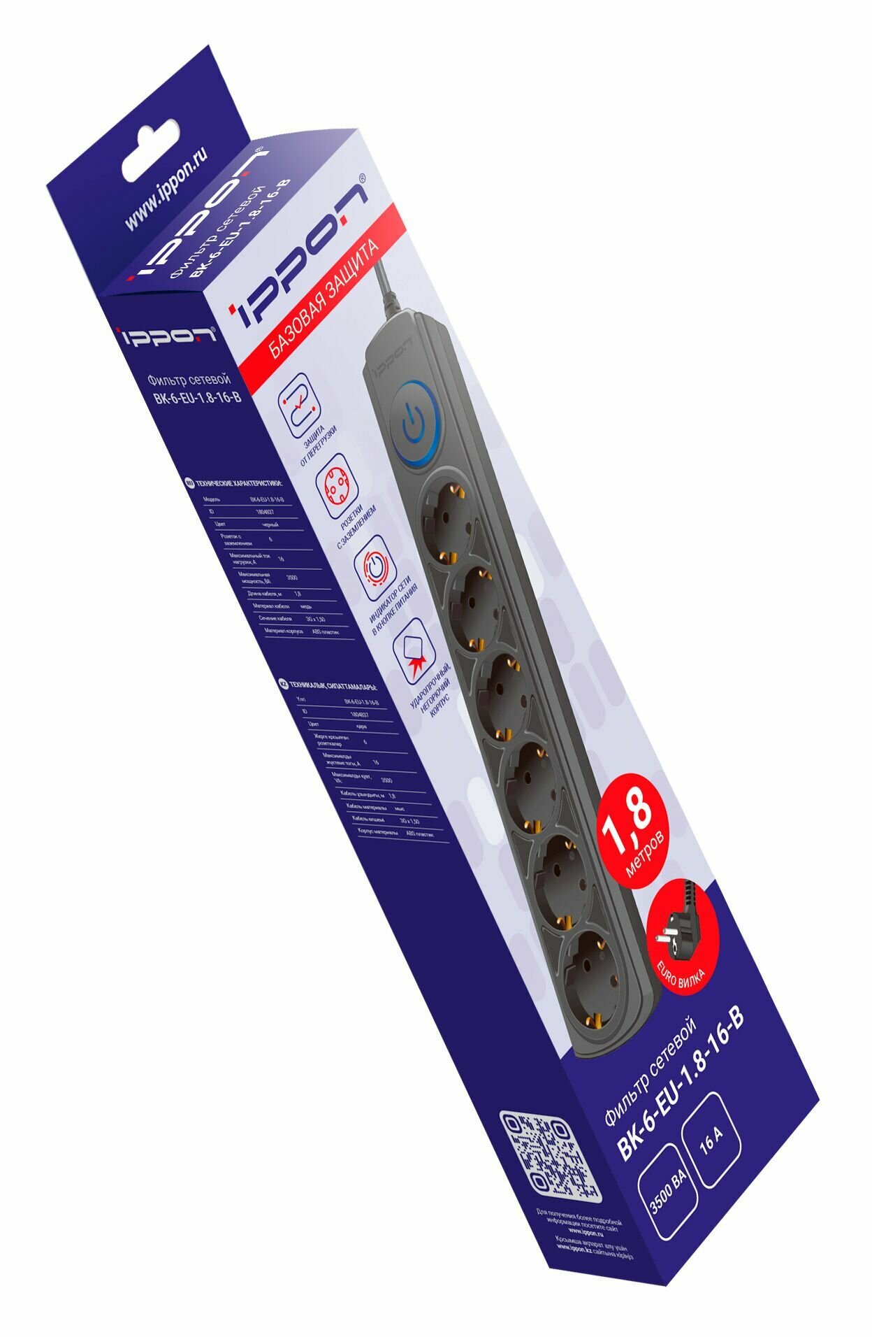 Сетевой фильтр Ippon 1.8м (6 розеток) черный (коробка) 1804837 BK-6-EU-1.8-16-B