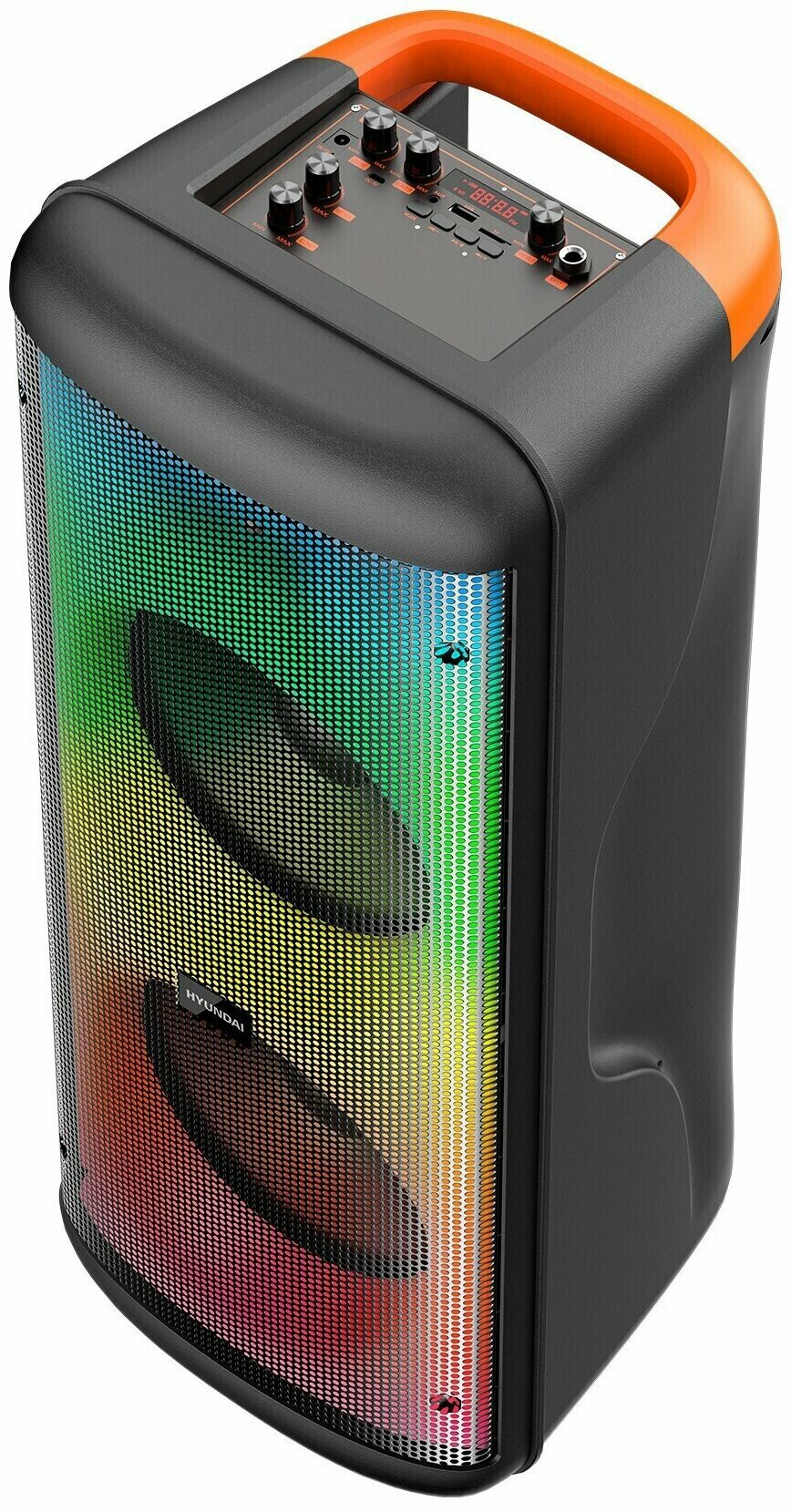 Аудиосистема Hyundai H-MC1235 обеспечивает высокую громкость и яркую многоцветную подсветку для любого мероприятия. Колонка оснащена двумя громкими и качественными стереодинамиками с суммарной мощностью до 80 Вт. Их долгое звучание обеспечивает аккумуляторная батарея ёмкостью 2400 мАч. Однако прибор также может работать и от сети. Все входы, нужные для подключения к девайсу, находятся на его верхней части: слот USB для флеш-накопителей памяти, порт для карт micro SD, разъём AUX и микрофонный вход для караоке-вечеринок и ведущих. Там же располагается яркий жидкокристаллический экран, показывающий инфо о текущем воспроизведении, регуляторы громкости и эха, а также кнопки, отвечающие за управление различными параметрами. Кроме того, устройство поддерживает синхронизацию со смартфоном при помощи Bluetooth (с TWS) и управление с пульта, идущего в комплекте поставки. Встроенный радио-тюнер – ещё одна удобная дополнительная функция данной модели. Корпус портативной колонки Hyundai H-MC1235 сделан из надежного, прочного и лёгкого сочетания металла и пластика, а динамики защищены отдельной решёткой. Рядом с верхней панелью управления прибора располагается эргономичная ручка, облегчающая переноску девайса. Аудиосистема оснащена красочной подсветкой, которая дополняет атмосферу вечеринки.