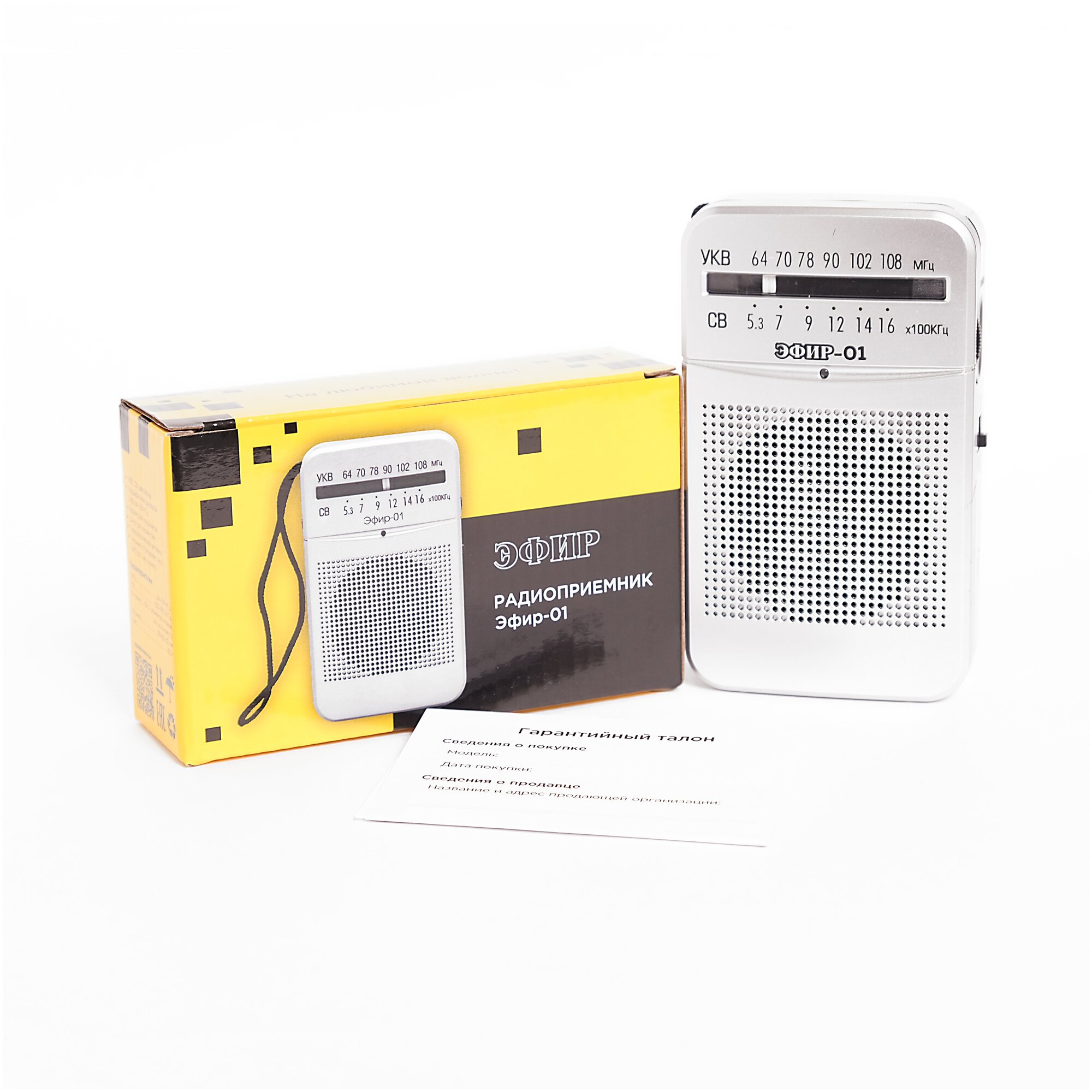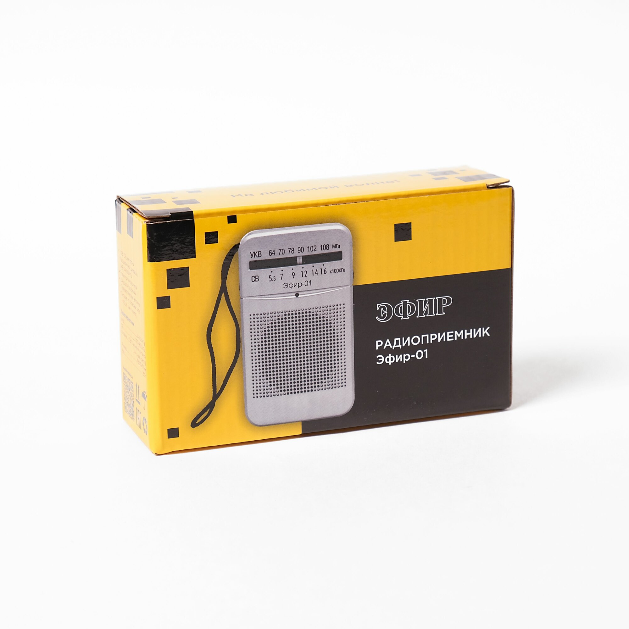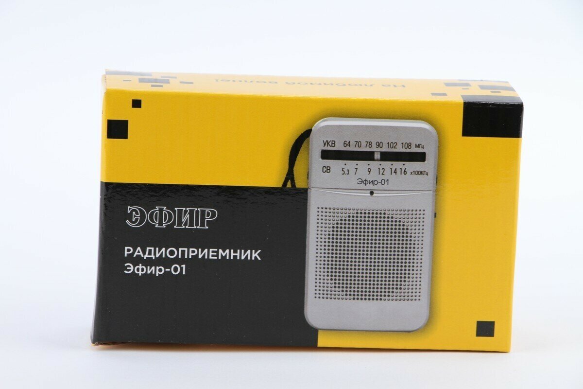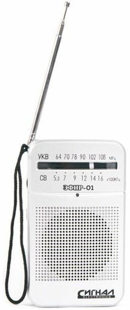 | Прочие особенности и свойства | Эфир-01 имеет аналоговый тип тюнера, обеспечивает сигнал в диапазонах УКВ/СВ с частотой УКВ (64-108МГц) / СВ (530-1600КГц) соответственно, наличие 1-го динамика с мощностью ?57mm/8?/3W. Радиоприемник работает от батареек AA*2шт, размер изделия составляет 118x29x72мм, так же есть ручка-шнурок, телескопическая антенна, разъем под наушники. |