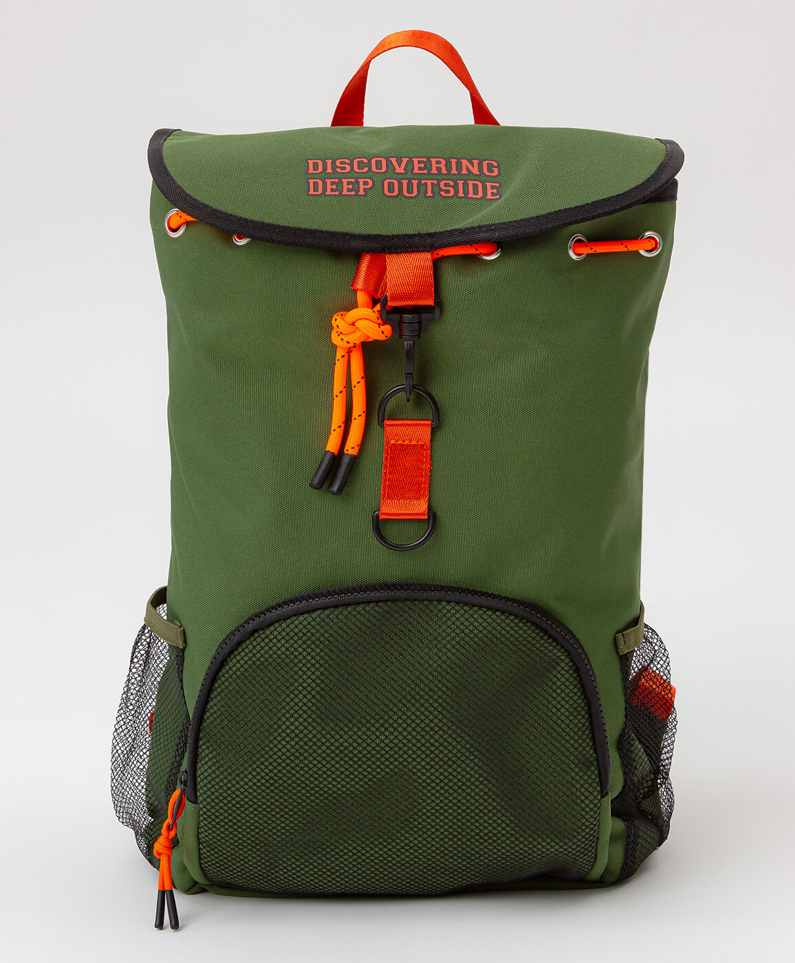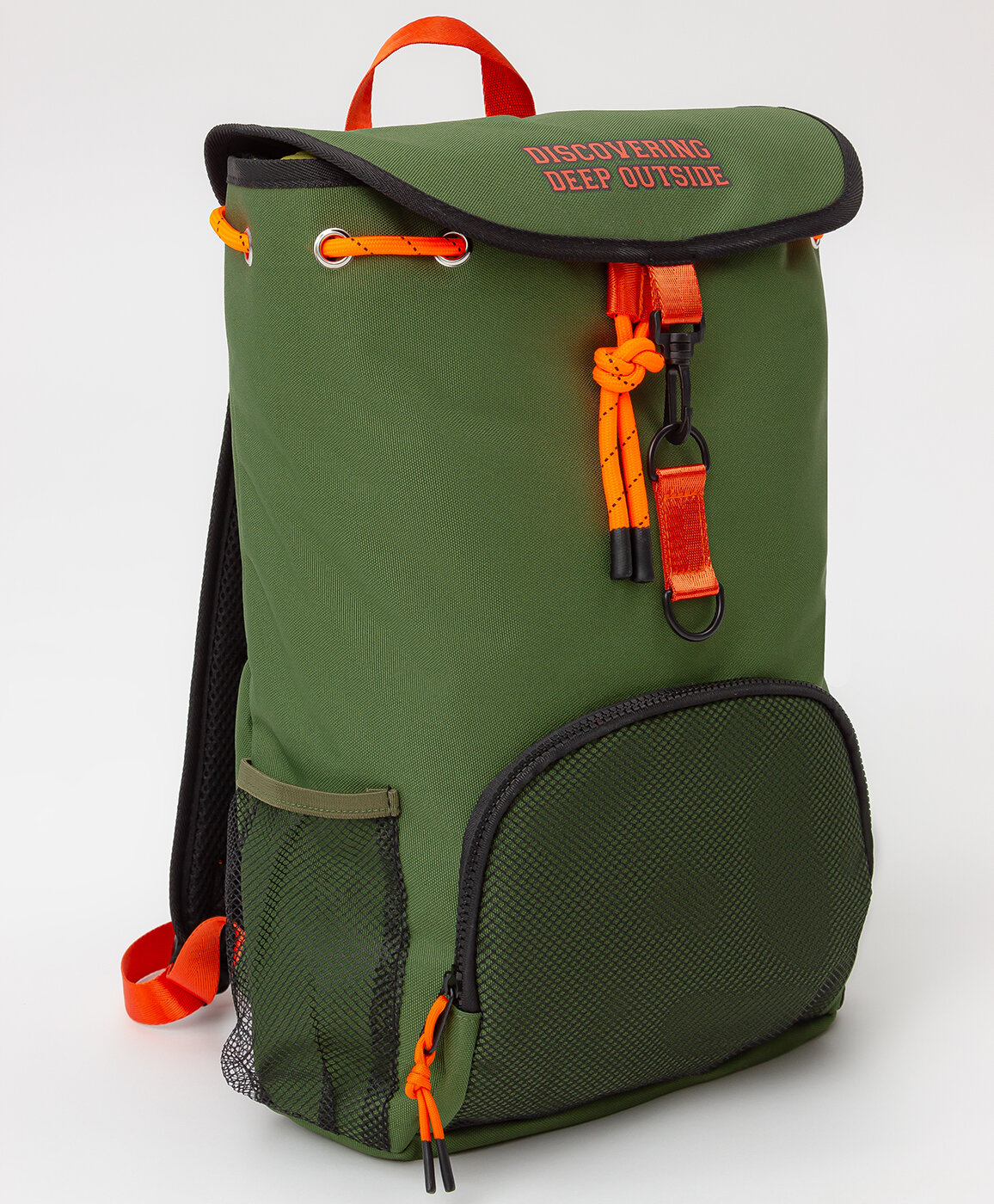 Зеленый рюкзак на широких регулируемых лямках с тремя накладными карманами. Основное вместительное отделение утягивается при помощи веревок с фиксатором и дополнительно застегивается на карабин. На полочке расположен сетчатый карман на молнии, по бокам - два удобных сетчатых кармана для вещей, необходимых в быстром доступе. Спинка рюкзака и дно укреплены для большей устойчивости. Регулируемые лямки легко настраиваются индивидуально под рост ребенка. Благодаря вшитой петле сверху корпуса модель удобно вешать на любой крючок. Два пластиковых колечка на полочке позволят прикрепить на карабинах нужные мелочи. Вместительный аксессуар незаменим на длительных прогулках и в путешествиях, при желании его можно носить в детский сад или школу. Стильный дизайн с яркими оранжевыми включениями в сочетании с текстовым принтом будет поднимать настроение ребенку. Детский рюкзак для мальчика идеально комбинируется с большим разнообразием одежды из коллекций Button Blue.