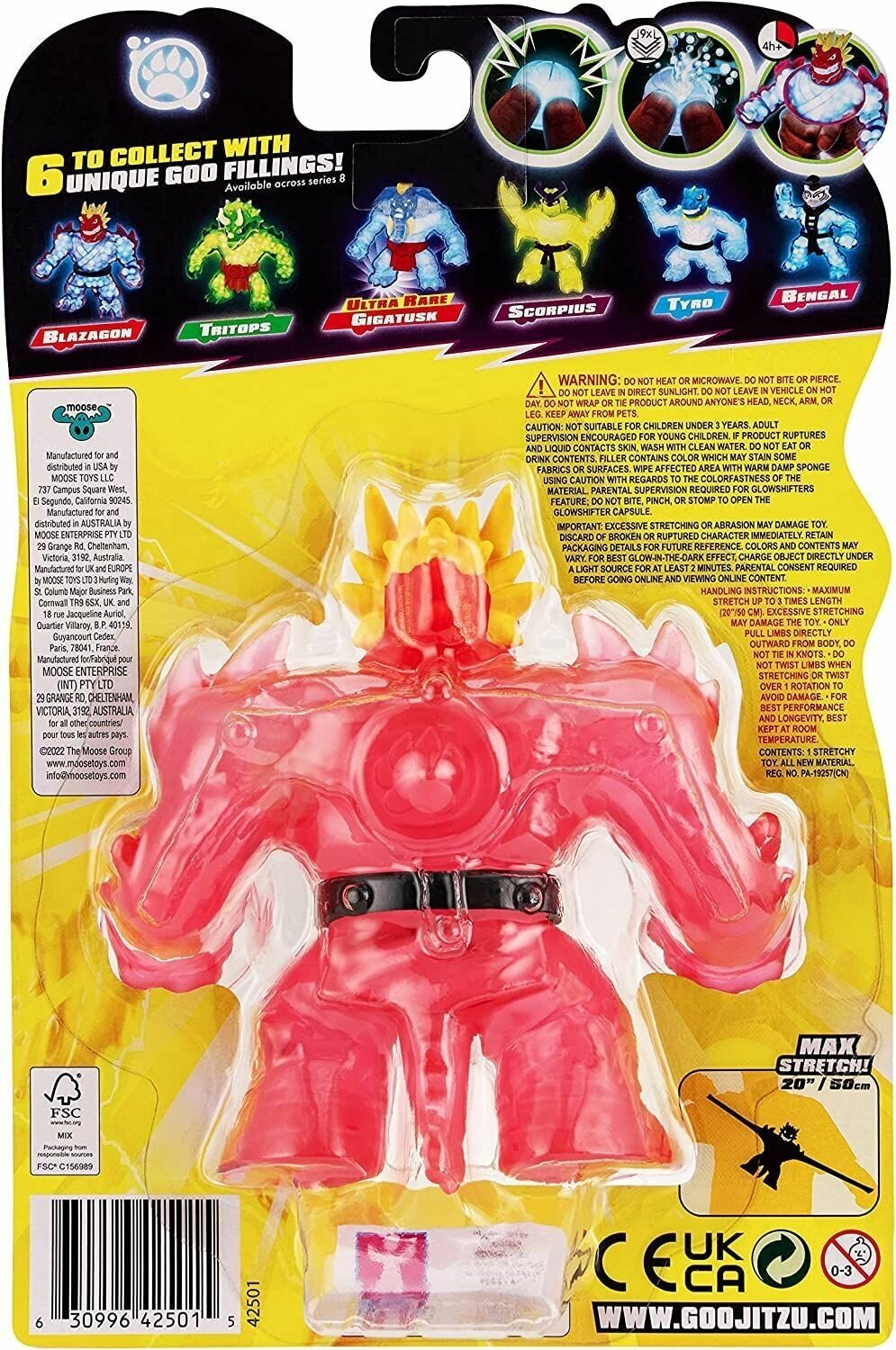 3. Тянущиеся фигурки Гуджитсу растягиваются в 3 раза и легко возвращаются к своей первоначальной форме и размеру. В новой линейке Гуджитсу Глоу Шифтрес монстры-герои активируют внутреннюю силу ГУ, чтобы сражаться в темноте. Тело Блейзагота окрашено в красный цвет и имеет мягкий наполнитель с жидкостью. А если выключить свет, Блейзагот будет светиться в темноте. Теперь ему любая тьма нипочем! Ищите других персонажей Гуджитсу серии Глоу Шифтерс: Тайро, Тритопс, Бенгал, Скорпиус и ультраредкий Гигабивень с особой силой Гу - Водная Атака. Высота фигурки - 12 см, съемный пояс. Внутри фигурки светящийся в темноте мягкий наполнитель с жидкостью. Игрушку рекомендуется заряжать прямо под источником света в течение 10 минут. Состав: ТПР, ПВХ, пластик (АБС), силикон, фосфоресцирующие акриловые шарики, полимерные материалы, вода. Товар сертифицирован и безопасен для детского использования. Упаковка: блистер (16,4 х 5,5 х 25 см).