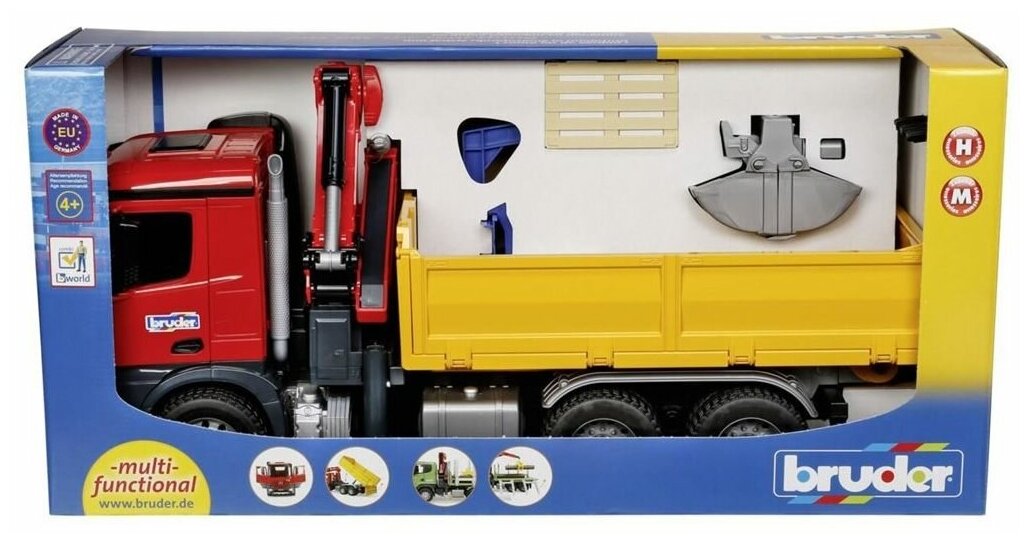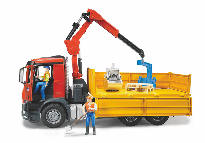 Данная модель совместима со всеми фигурками и аксессуарами Брудер! Структура транспортного средства состоит из поворотного грузового отсека с тремя откидными сторонами. В комплекте есть кран, который может поворачиваться на 360 градусов. Данный кран может фиксироваться в любом положении. Кроме того имеются выдвижные опоры для большей устойчивости при работе на стройке.