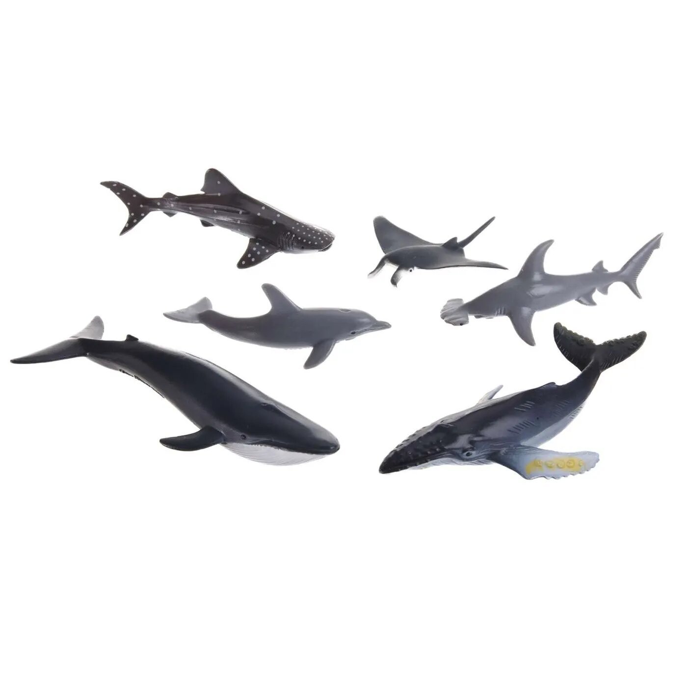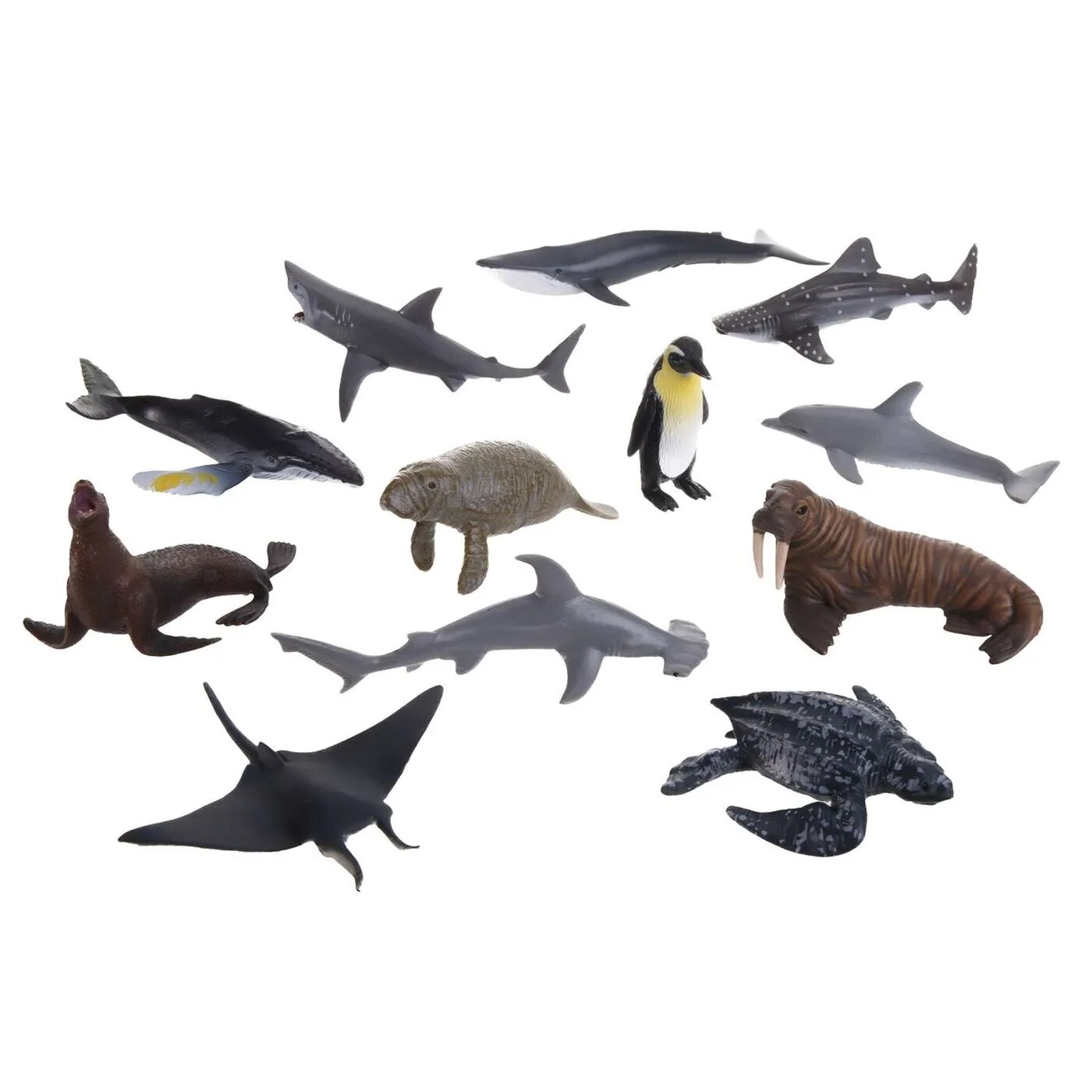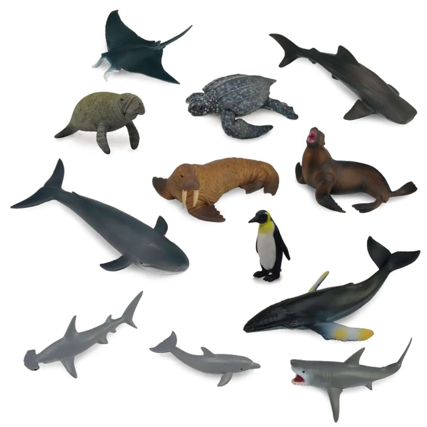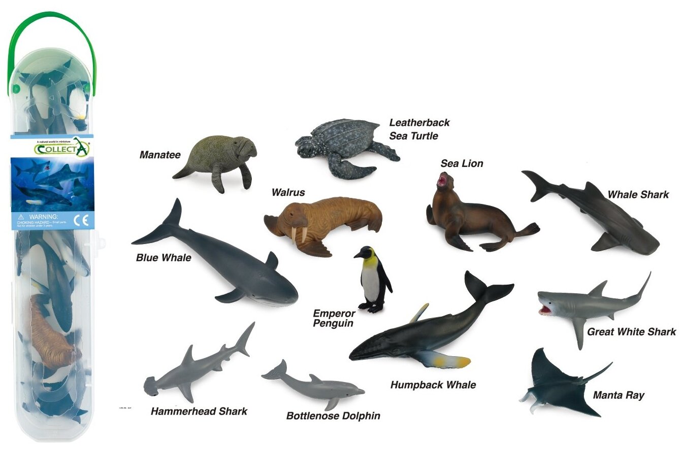 В наборе: 12 фигурок морских животных серии Коллекта. Состав: пластмасса. Компактная подарочная упаковка с размерами 26,7 х 6 х 4 см. Размер животных от 6 до 10, 5 см. Для детей от 3-х лет. Набор познакомит детей с 12-ю обитателями морского мира: моржом, морской черепахой, императорским пингвином, акулой-молотом, горбатым китом, большим белым китом, мантой и другими. Каждый из животных представляет большой интерес для любителей природы. Например, манта, или морской дьявол — самый крупный скат из своего семейства. Ширина отдельных особей достигает в ширину 9 метров, а вес — 3 тонны. Встречаются на прибрежных зонах в тропиках и субтропиках. Каждая особь имеет уникальную окраску, которая позволяет их узнавать. В далекие времена считалось, что животное могло завернуть человека и задушить. Но, как оказалось, скат не представляет для него никакой опасности. Особенности набора Играя с данным набором, ваш ребенок сможет детально рассмотреть каждого животного. Коллекцию можно использовать для развития воображения и познавательных навыков. С помощью взрослых малыш узнает о животных все самое интересное: как выглядит, где обитает, чем питается. Все фигурки являются точной копией морских животных и имеют реалистичную окраску. Хранятся в специальном кейсе, поэтому их удобно транспортировать. Подходит для игр с друзьями.