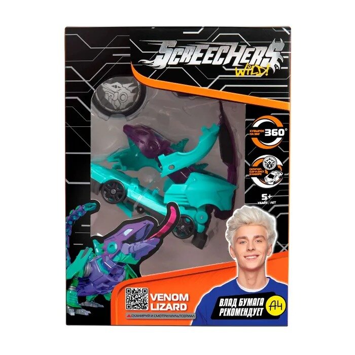 Скричер LEVEL 1 трансформируется, совершая кувырок на 360°.Дополнительный элемент трансформации в наборе! Теперь можно выбирать сценарий баттла: усиленный скричер-диск 4 сезона для запуска вперед или скричер-кар для продолжения в гонке.Дикий Скричер Level 1 разгоняется, делает кувырок на 360° и запускает скричер-диск или скричер-кар вперёд, самостоятельно трансформируясь прямо в воздухе. Обратно в машинку игрушка собирается вручную. Несколько движений - и она готова к новому кувырку.Машинка-трансформер "Веном Лизард" превращается в токсичную ящерицу!Устрой баттл – стань крутым скричером!В набор входит машинка-трансформер (2х5х7см), энергетический диск, скричер-кар, коллекционная карточка. Игрушка упакована в коробку с окном (14х18х10 см).Играть со скричером можно где угодно, никаких дополнительных приспособлений не требуется. Машинка-трансформер выполнена из высококачественного материала, товар сертифицирован.Эксклюзивный дистрибьютор бренда "Дикие Скричеры" на территории РФ - компания "РОСМЭН".Узнай, каким скричером баттлит твой кумир! Ищи послание любимого блогера на коллекционной карточке внутри!