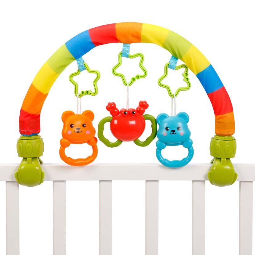 Эту дугу можно закрепить на детской кроватке, коляске или автокресле с помощью удобных прищепок. Угол наклона дуги регулируется. Сначала малыш будет просто рассматривать яркие игрушки, лежа на спинке, но со временем он обязательно начнет тянуться к ним ручками и ножками, совершенствуя свои двигательные навыки. Игрушки на дуге имеют различные цвета и формы, в том числе материал — специально для развития тактильных ощущений малышей. Изделие изготовлено из текстильных материалов с элементами пластмассы.