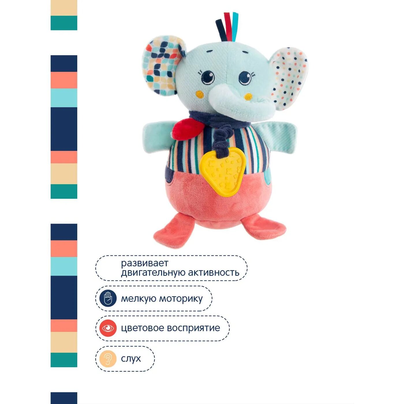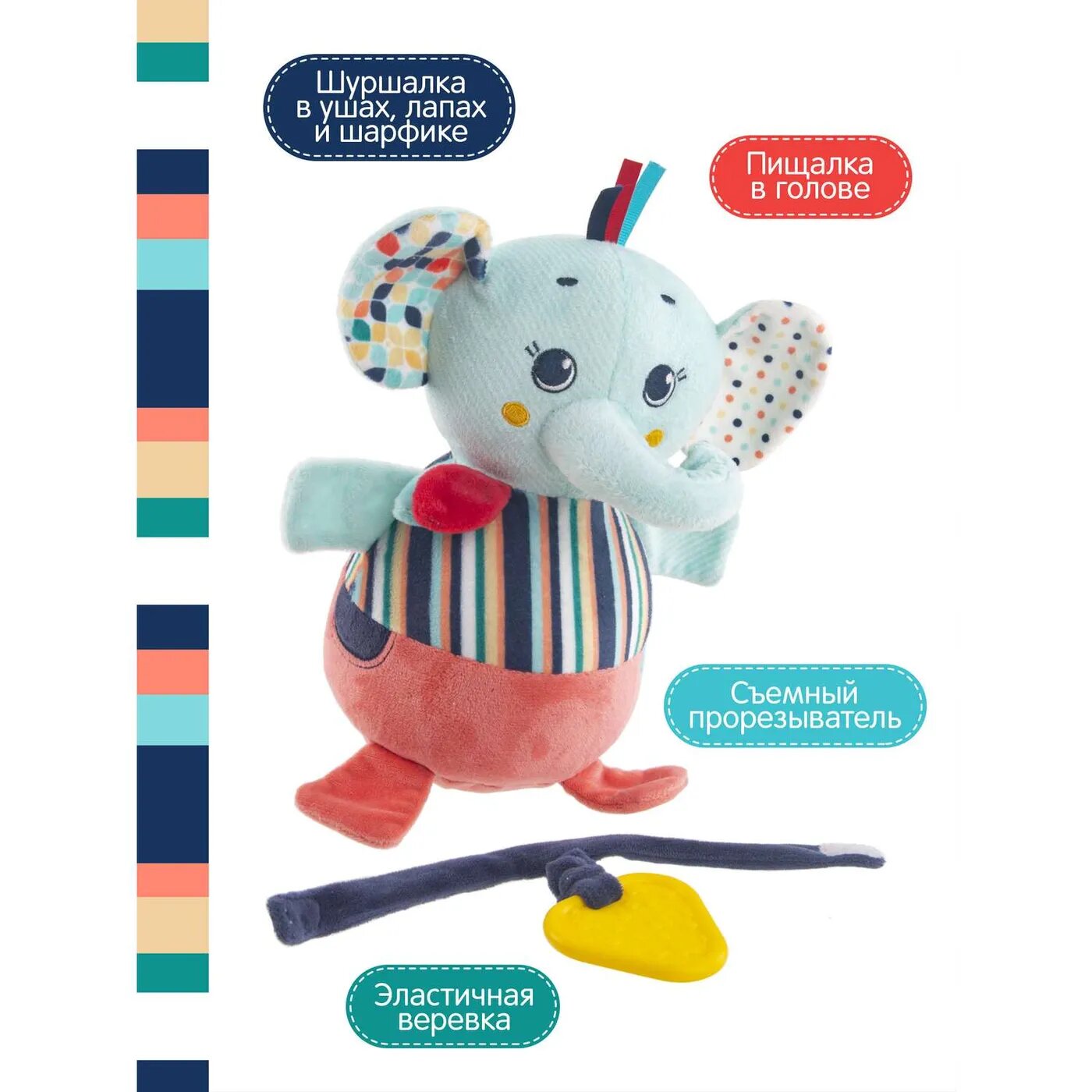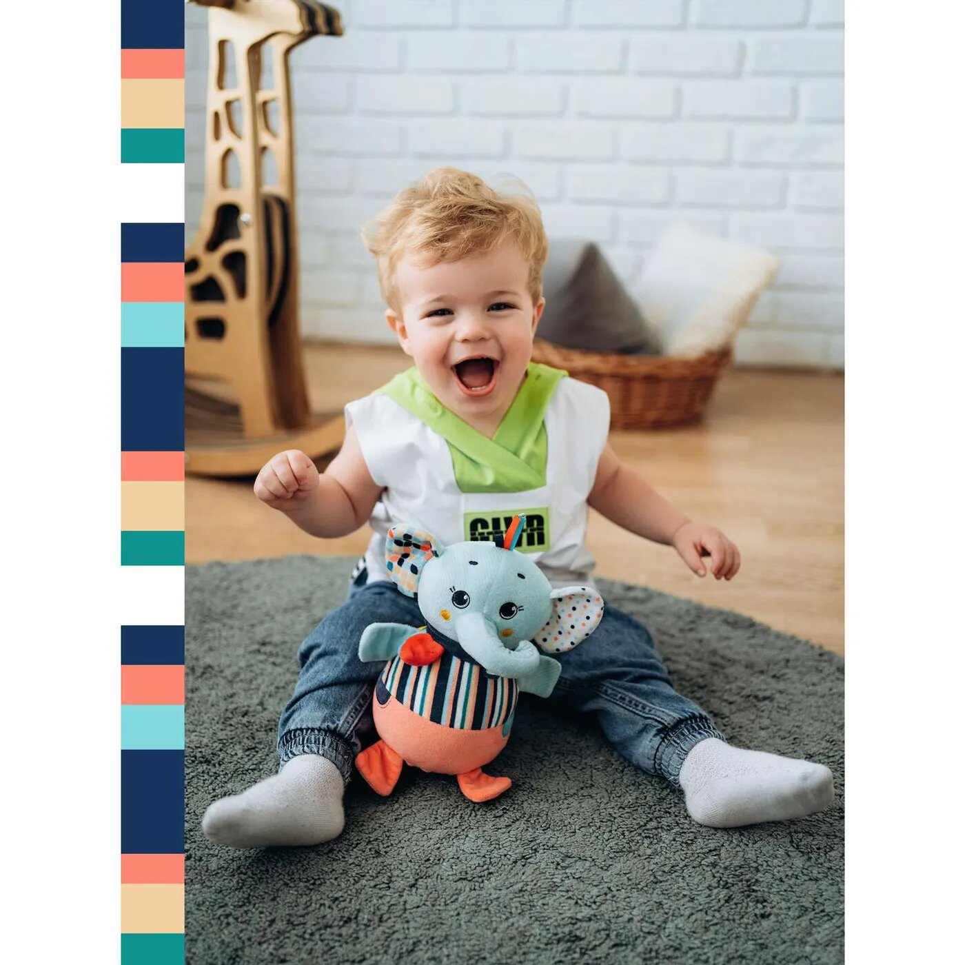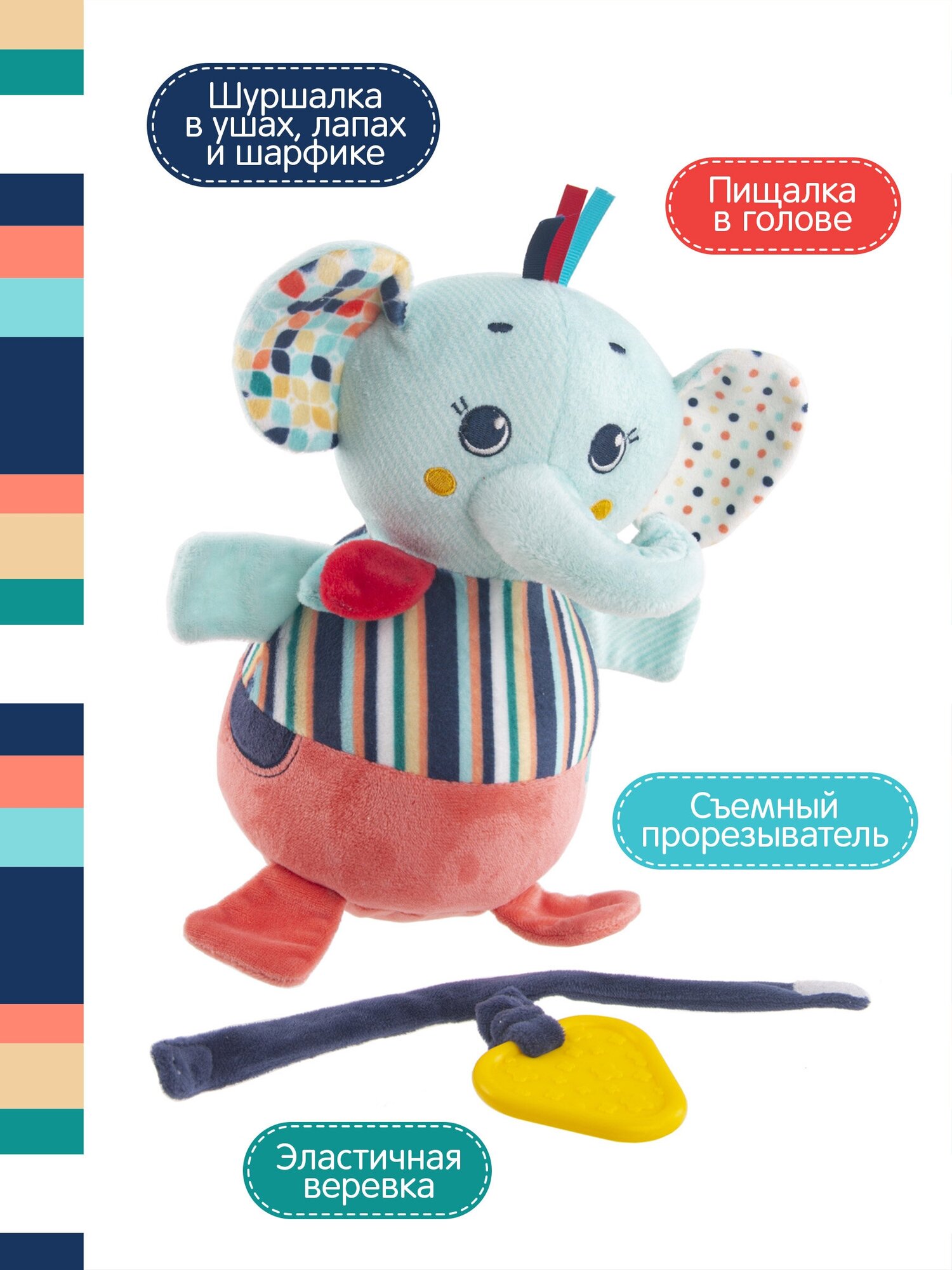 В игрушке: пищалка в голове, съемный прорезыватель, шуршалка в ушах, лапах и шарфике, эластичная веревка, механизм-неваляшка.Развивающая игрушка-неваляшка Слоник Джамбо приведет в восторг любого малыша и обязательно станет его любимой игрушкой. Слоник качается в разные стороны, издавая при этом чудесный мелодичный звон, и всегда возвращается в вертикальное положение. Съемный мягкий прорезыватель поможет облегчить дискомфорт во время прорезывания зубов. В голове имеется пищалка, а в ушках и лапках - шуршалки. Игрушка-неваляшка развивает двигательную активность, мелкую моторику, слух и цветовое восприятие.