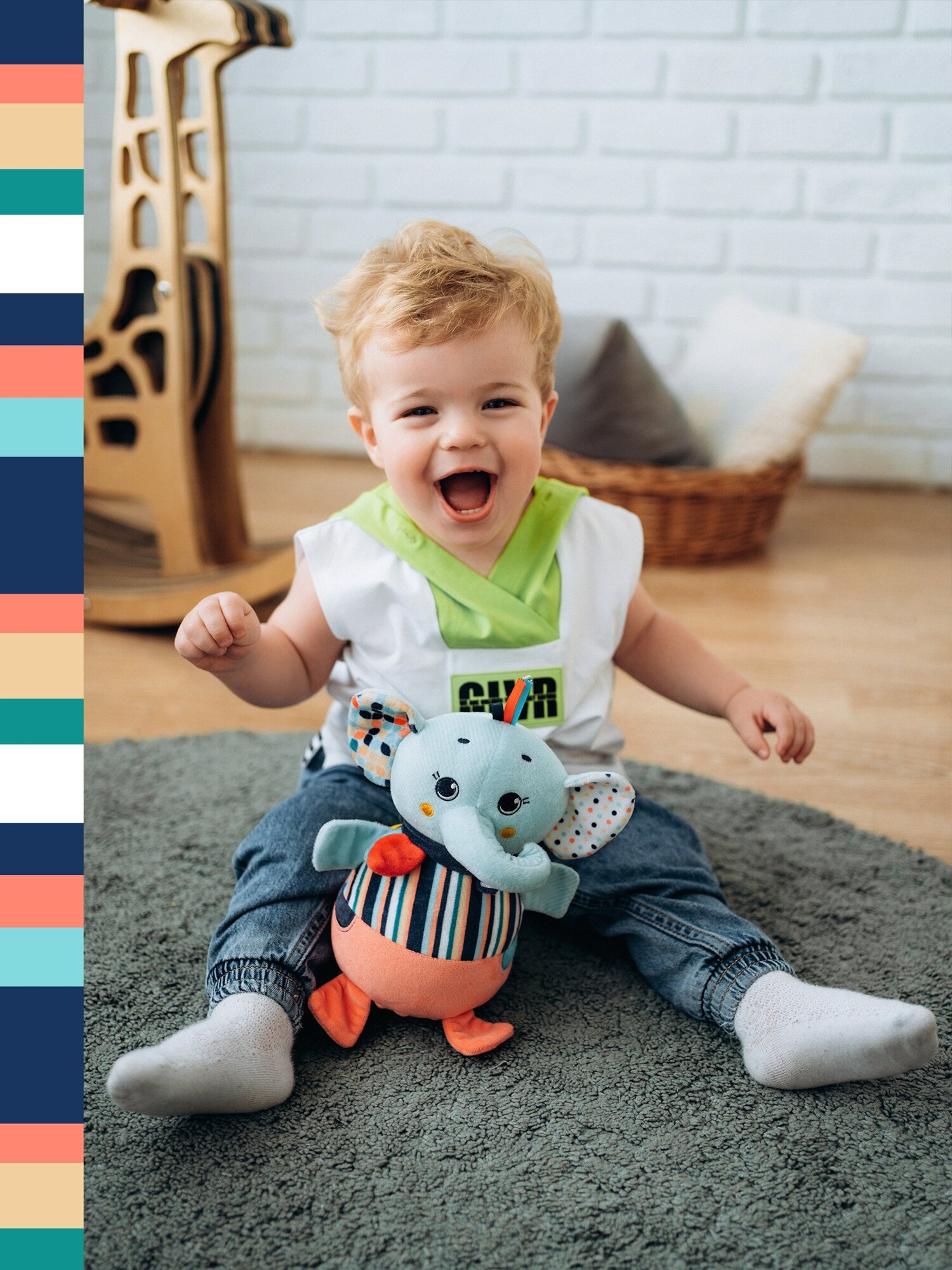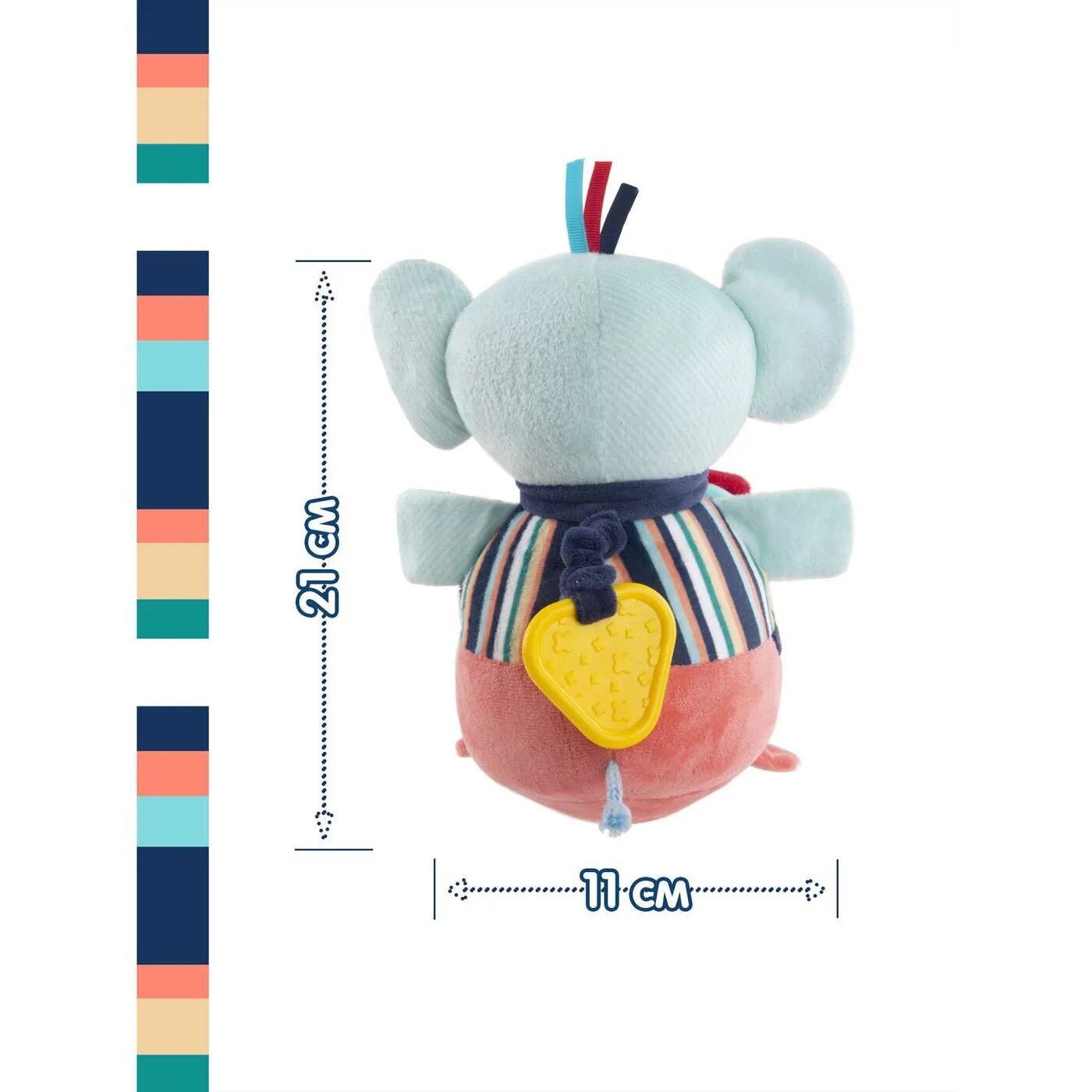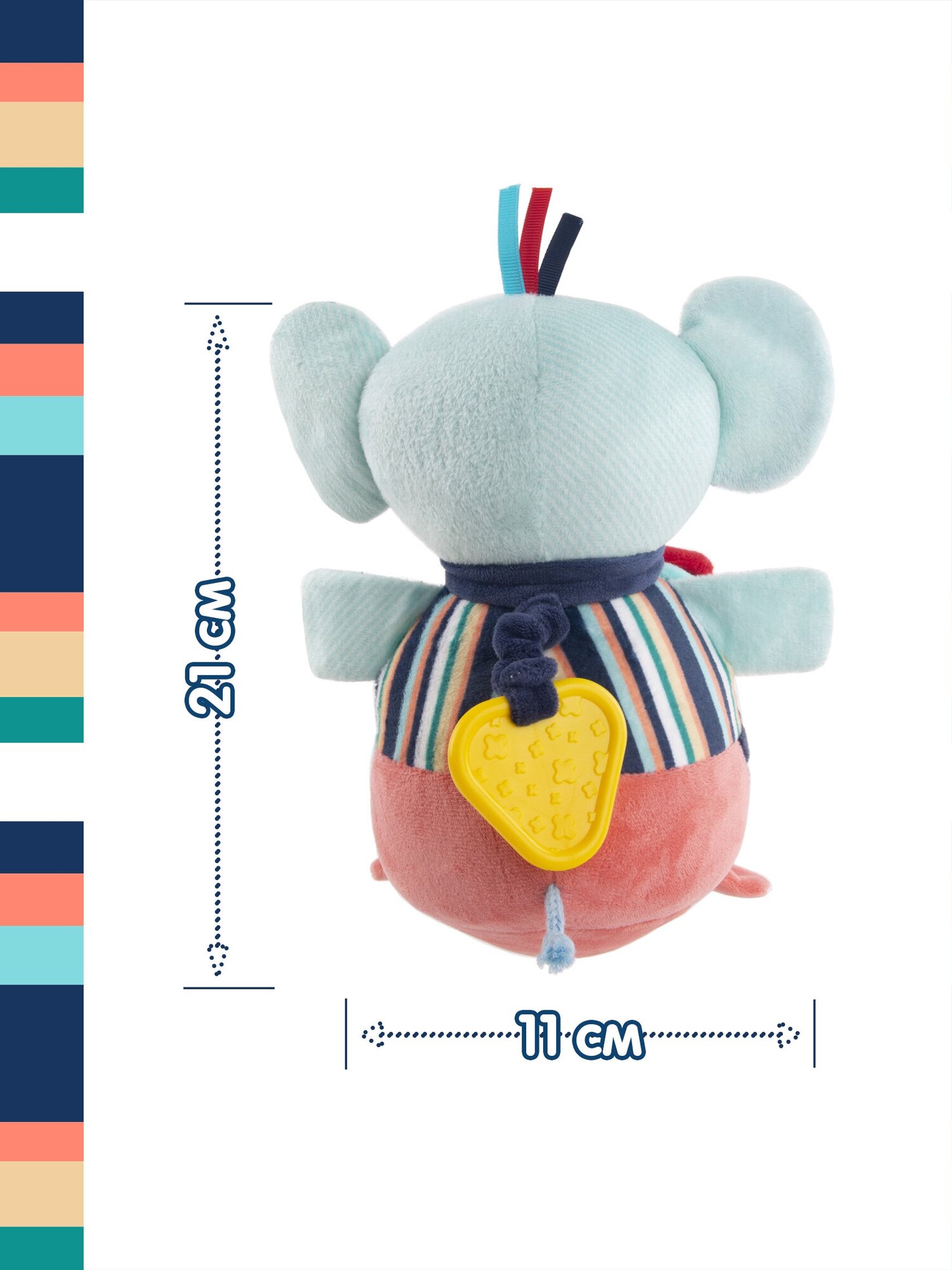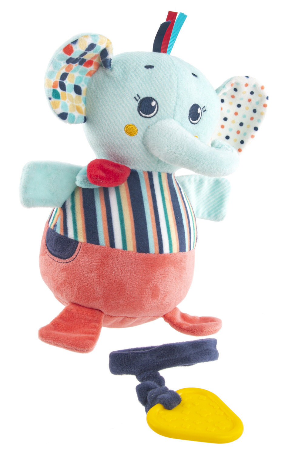 В игрушке: пищалка в голове, съемный прорезыватель, шуршалка в ушах, лапах и шарфике, эластичная веревка, механизм-неваляшка.Развивающая игрушка-неваляшка Слоник Джамбо приведет в восторг любого малыша и обязательно станет его любимой игрушкой. Слоник качается в разные стороны, издавая при этом чудесный мелодичный звон, и всегда возвращается в вертикальное положение. Съемный мягкий прорезыватель поможет облегчить дискомфорт во время прорезывания зубов. В голове имеется пищалка, а в ушках и лапках - шуршалки. Игрушка-неваляшка развивает двигательную активность, мелкую моторику, слух и цветовое восприятие.
