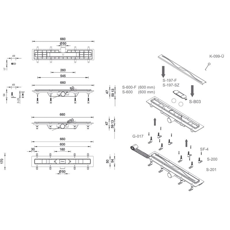 Душевой трап Styron линейный с решеткой гидрозатвором и горизонтальным выпуском 50мм STY-Do-60