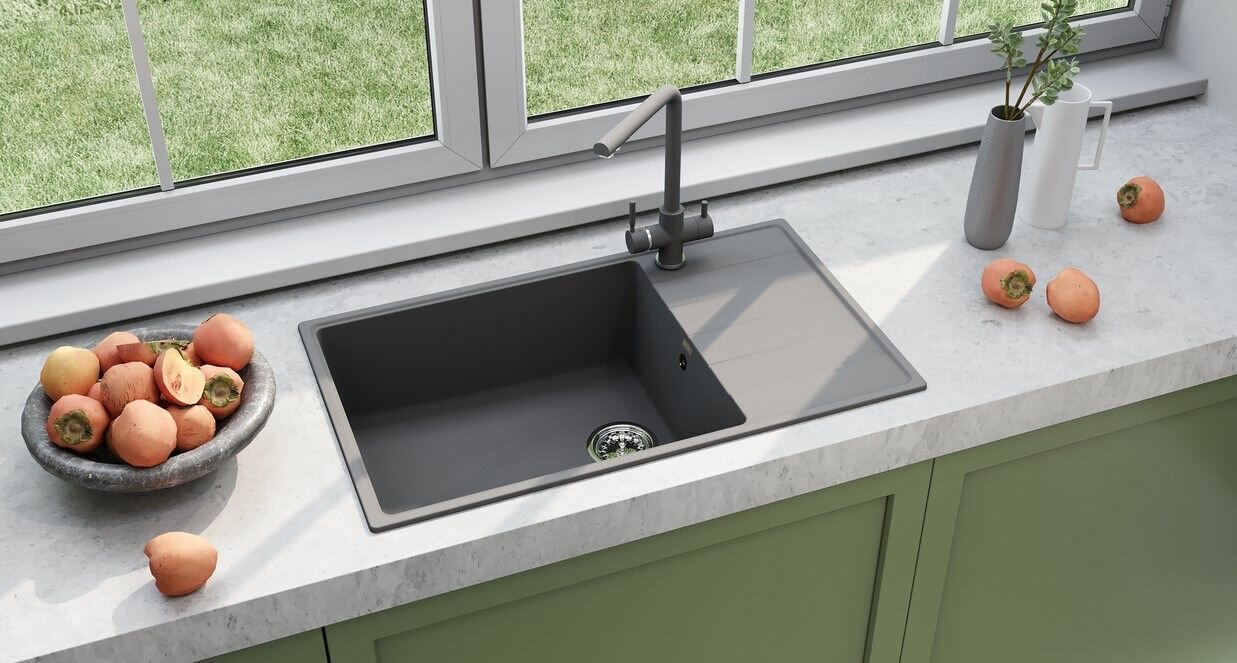 Реверсивная мойка из кварцевого композита ULGRANIT на основе акрилированных термоактивных полиэфирных смол (20%) и пигментированного кварцевого песка (80%).