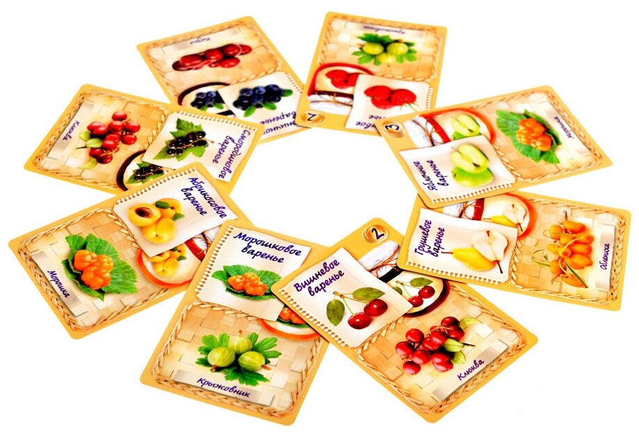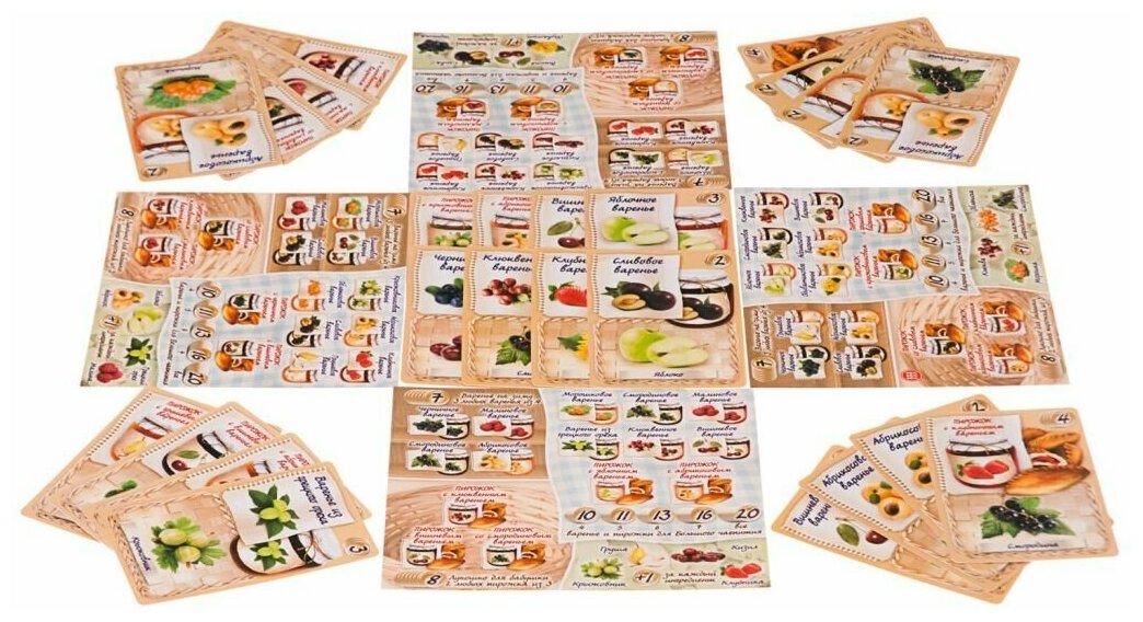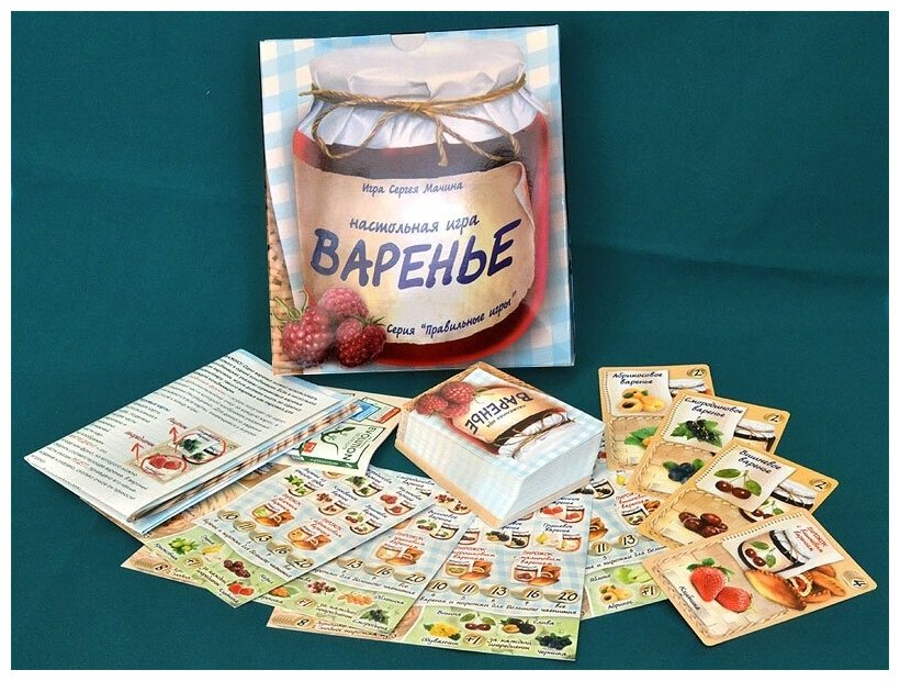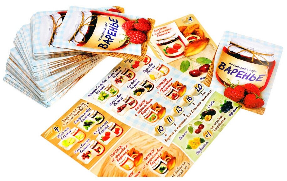 Настольная игра Варенье предложит Вам необычный игровой сюжет, в котором можно почувствовать себя настоящим поваром. Готовьте разнообразные вкусности по карточкам заданий. Разные пирожки и баночки варенья смогут принести разное количество очков. Следите за своими ингредиентами и правильно знакомьтесь с рецептами, чтобы ничто не смогло отвлечь Вас от кулинарной гонки, ведь кто больше всех напечет и наготовит, тот и одержит победу!